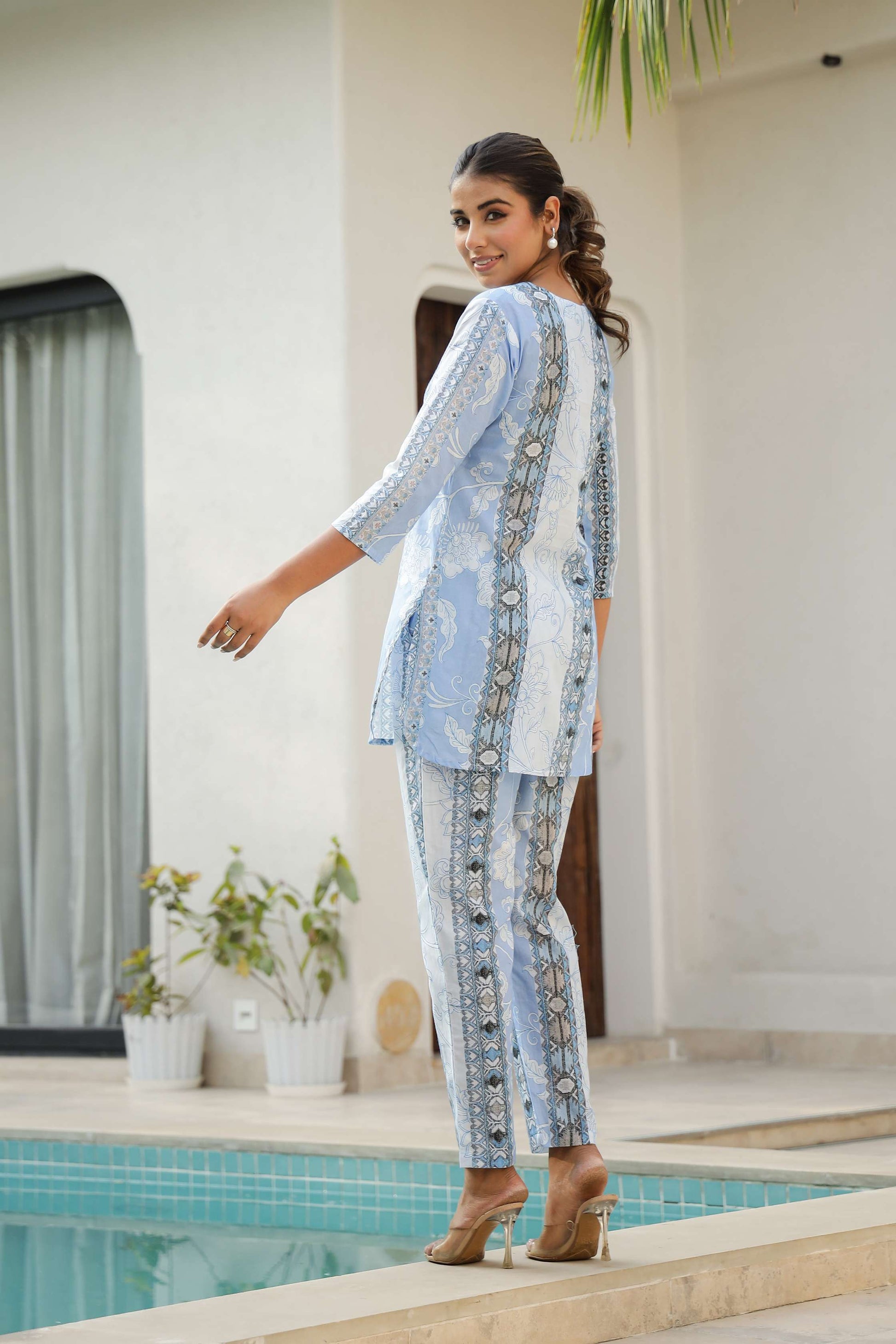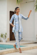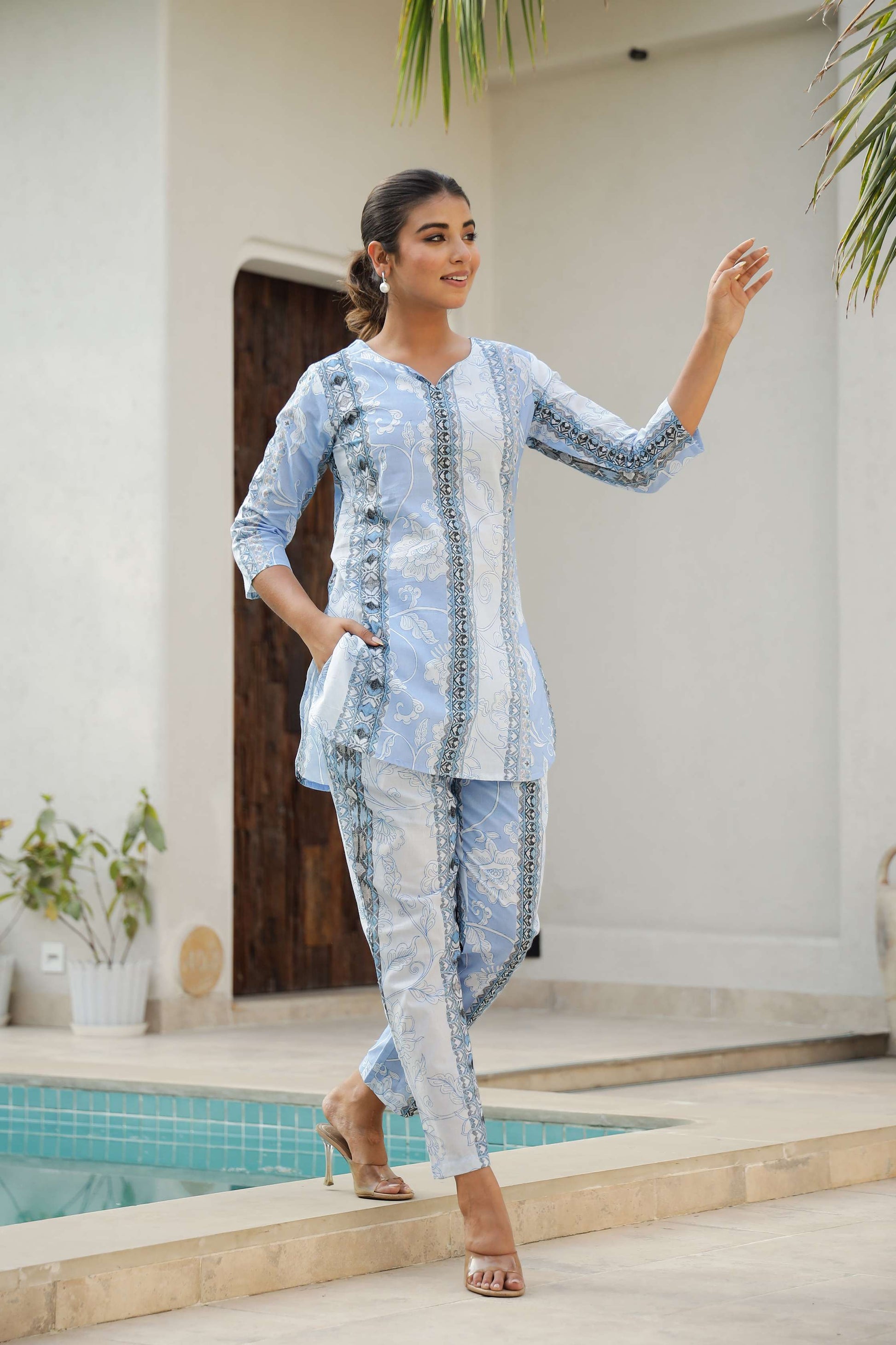 Step into a world of calm and charm with this sky blue and white co-ord set, made to flatter the modern Indian woman. The soft cotton fabric and vertical floral print panels lend a slimming effect and an elegant flow, making it a favorite for warm days and breezy evenings alike.