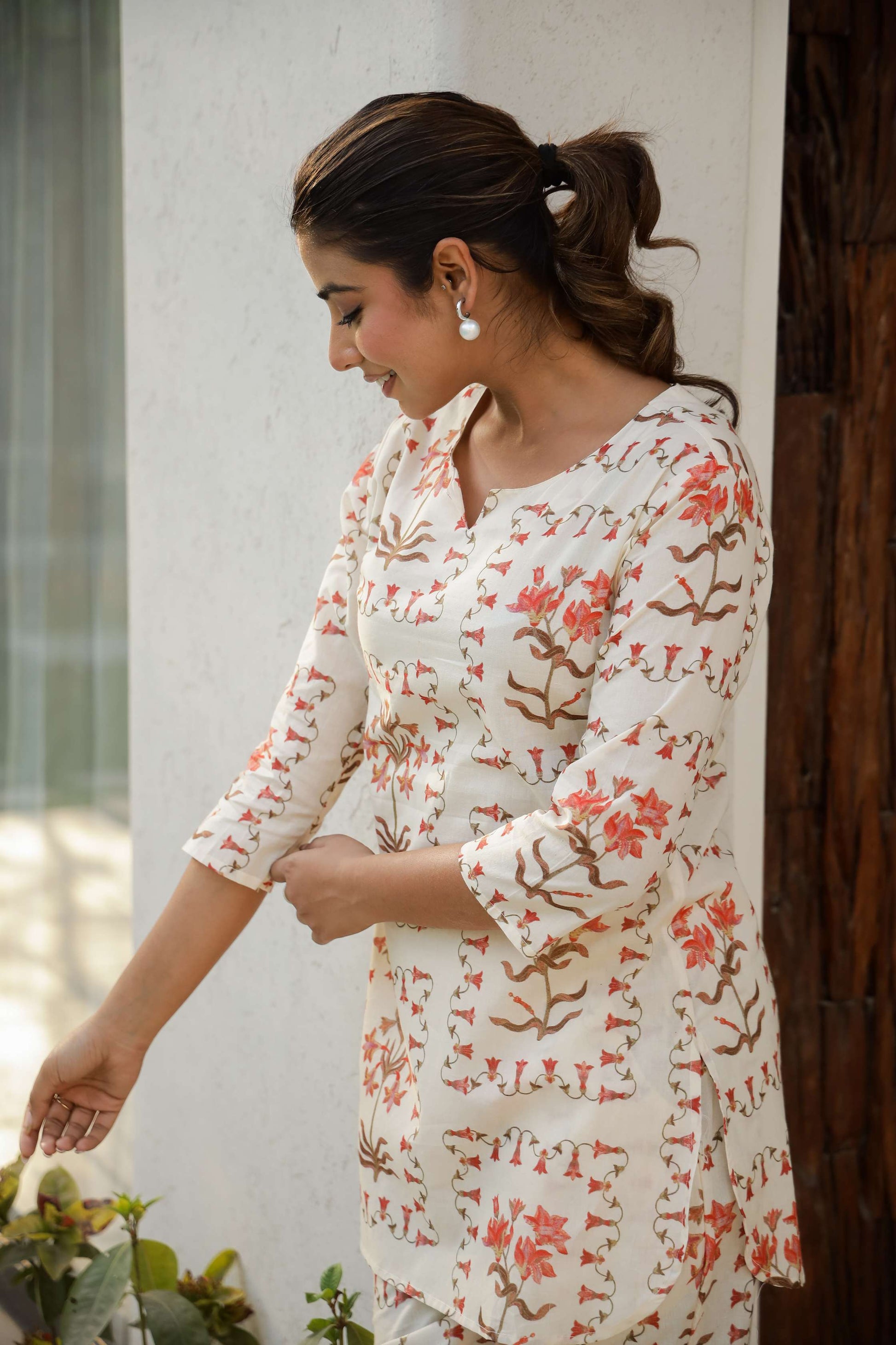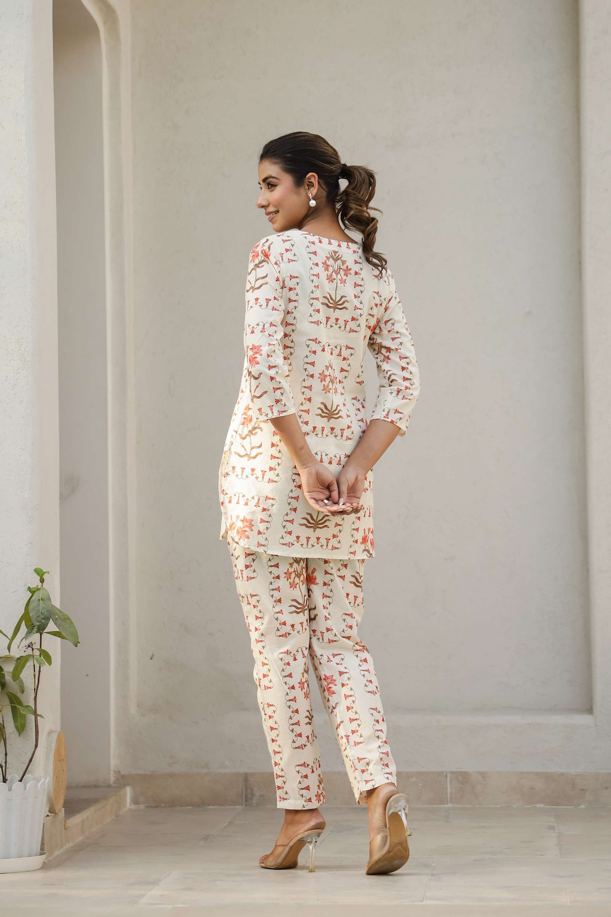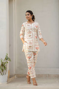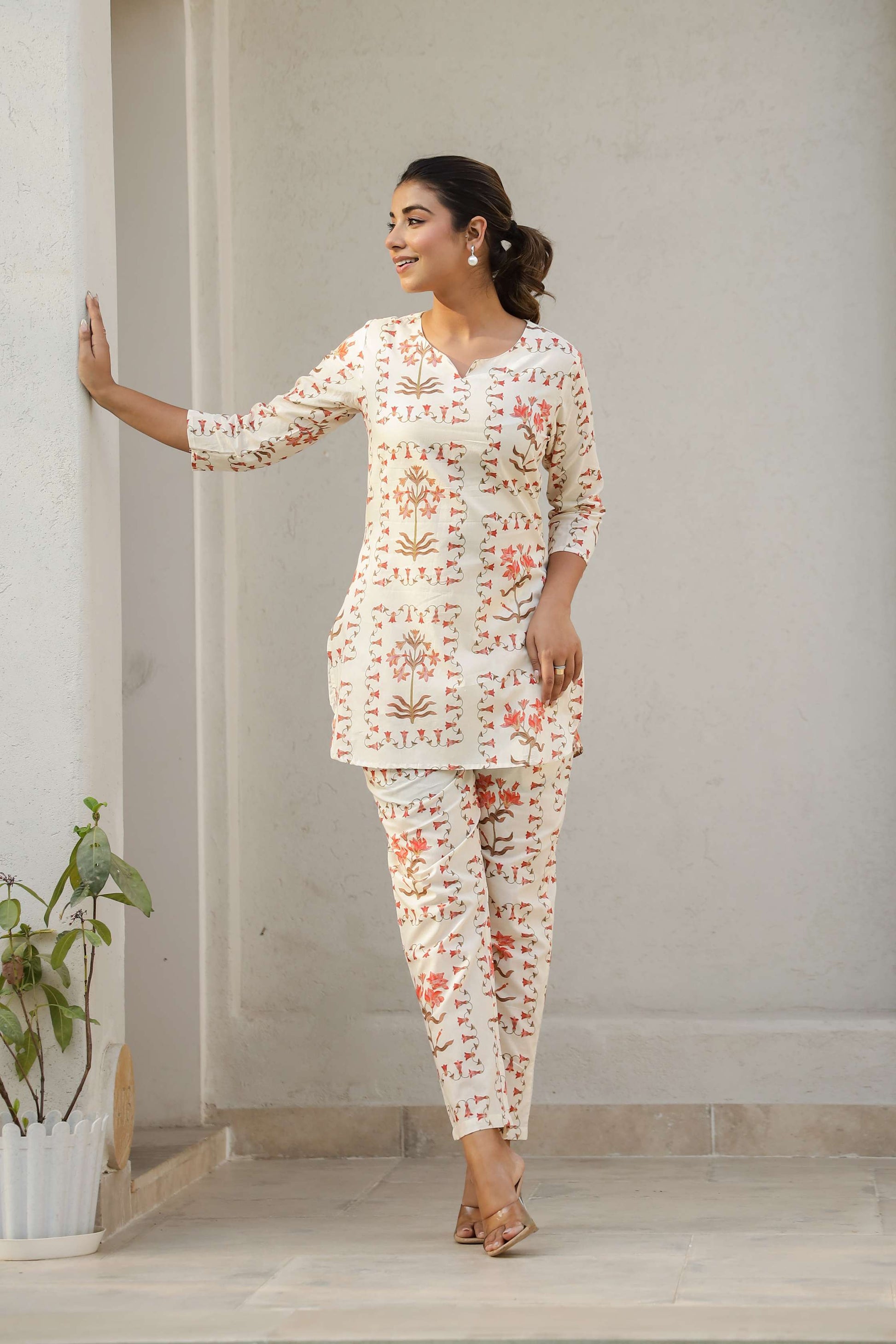 Infuse charm and comfort into your wardrobe with this rust floral co-ord set, tailored for the modern Indian woman. Crafted from soft, breathable cotton, this cream-toned set features subtle floral block-style prints in earthy hues. Ideal for summer lounging, travel days, or casual catch-ups with friends, it's your go-to pick for effortless elegance.