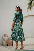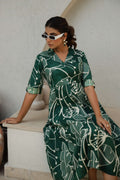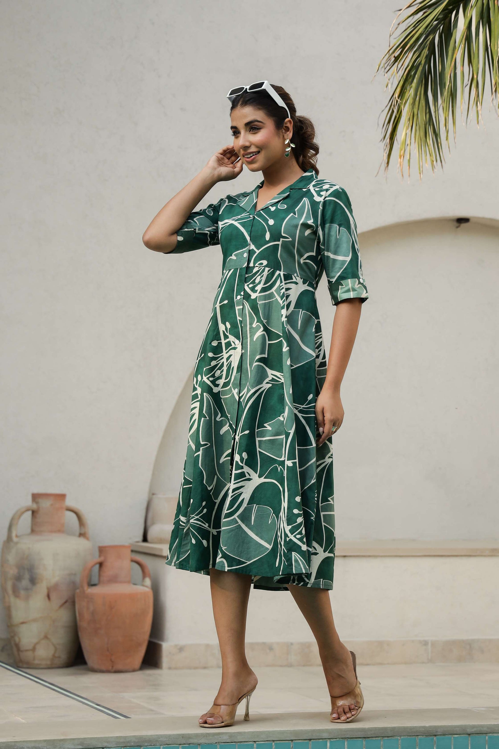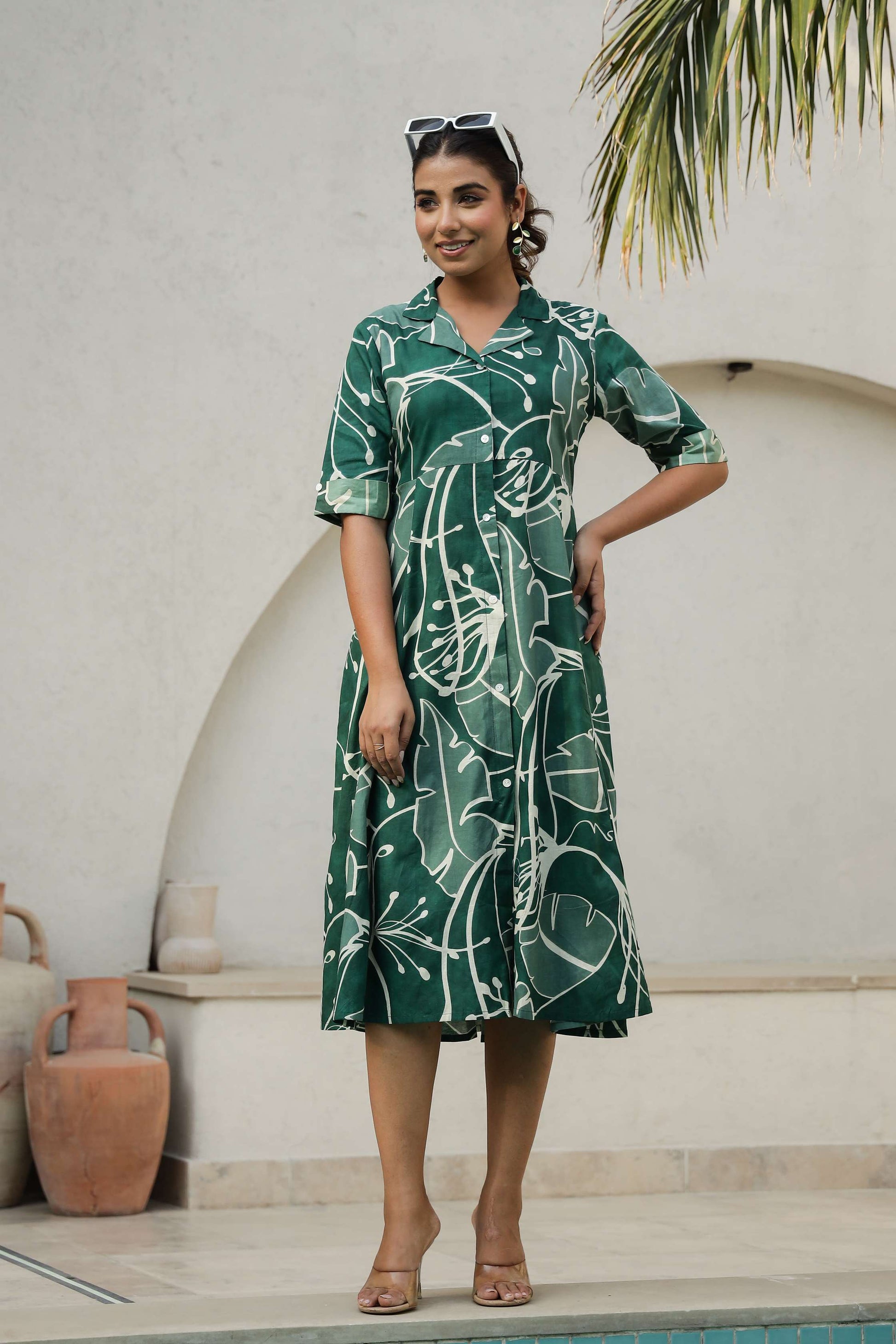 A statement in sophistication and comfort — our Dark Green Abstract Cotton Shirt Dress is crafted from soft, breathable cotton and tailored in a relaxed flared silhouette. This midi dress features a shirt collar and front button placket, with a nature-inspired abstract white print that gives it a bold and modern twist.