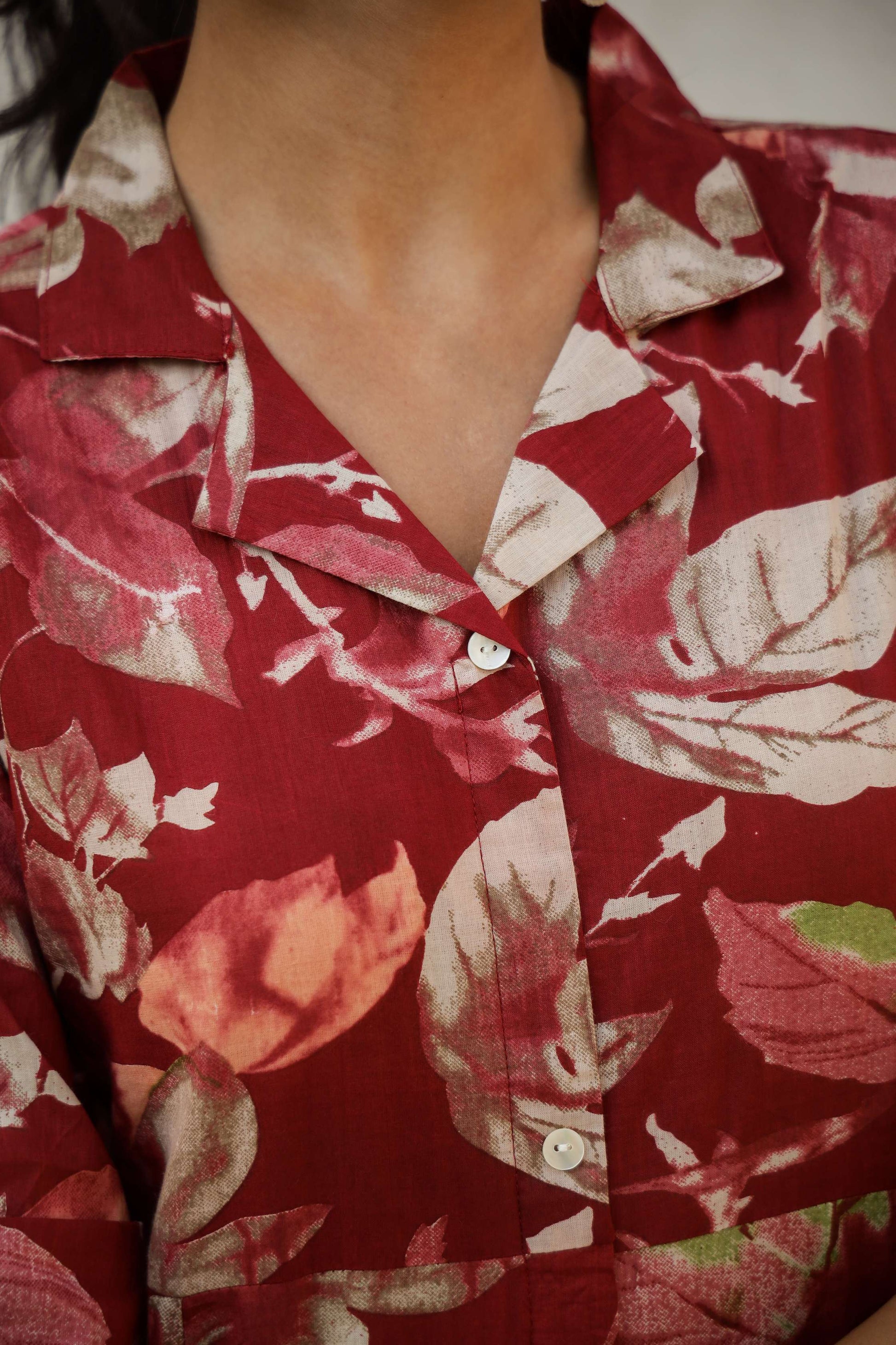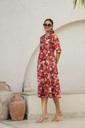 Fall in love with florals in our Red Floral Cotton Shirt Dress – a timeless midi dress perfect for breezy summer days and stylish brunch outings. Made from pure cotton, this piece blends sophistication with ease, featuring a flattering flared silhouette, classic shirt collar, and button-down front.