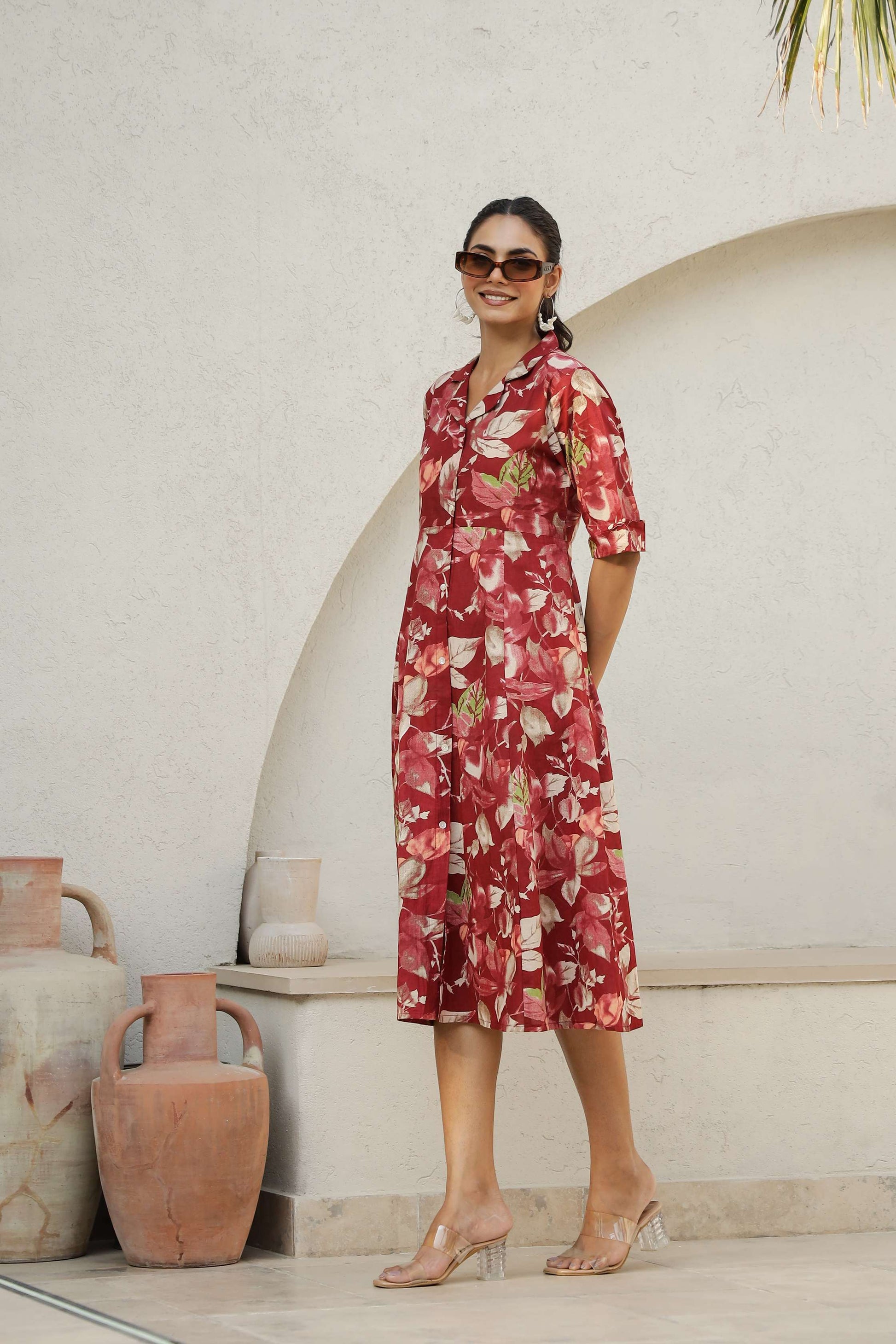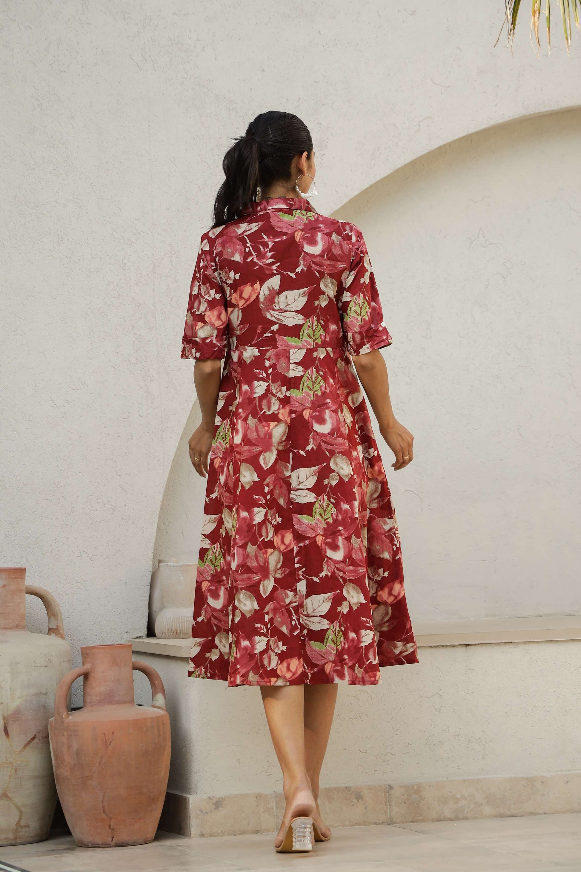 Red Floral Cotton Shirt Dress – Elegant Flared Midi