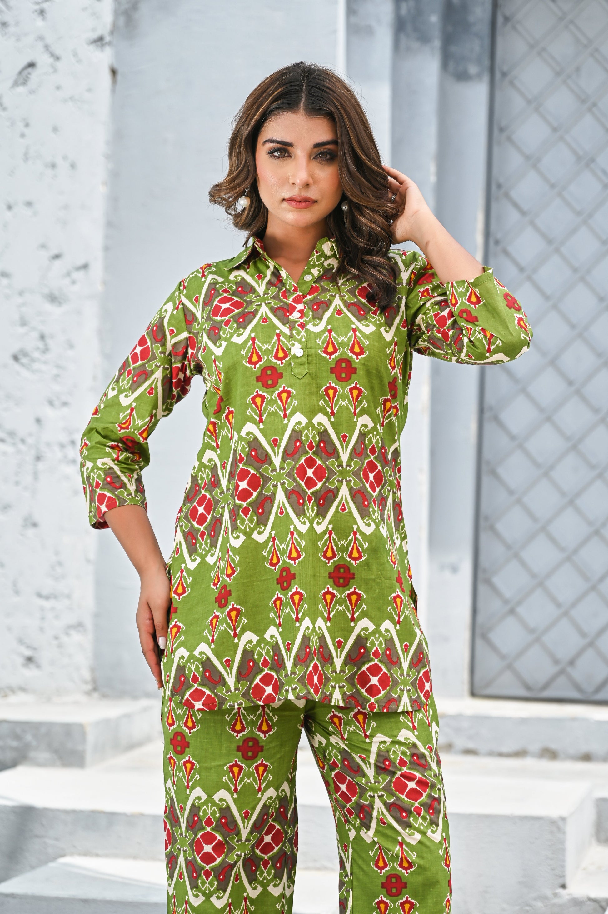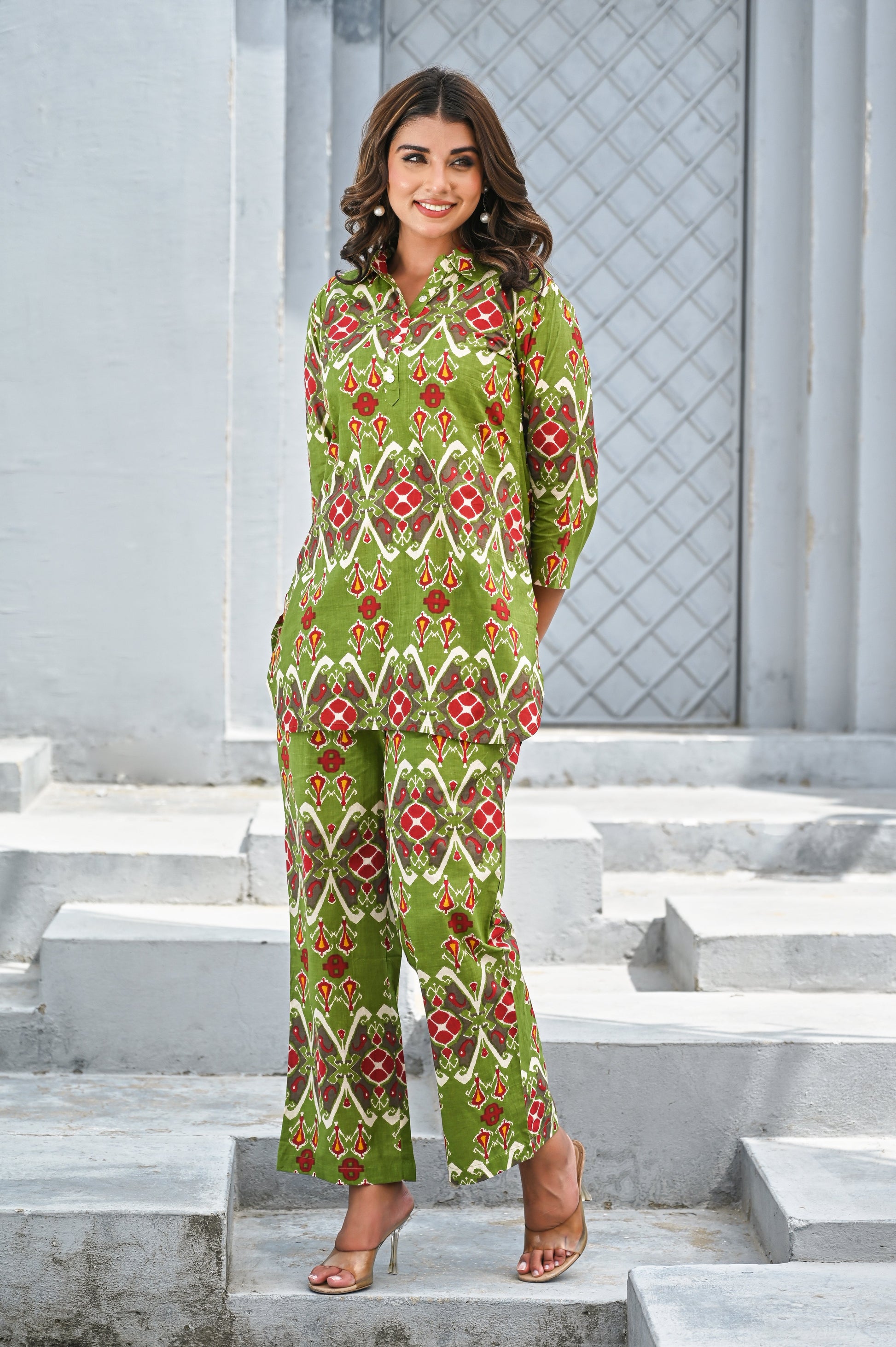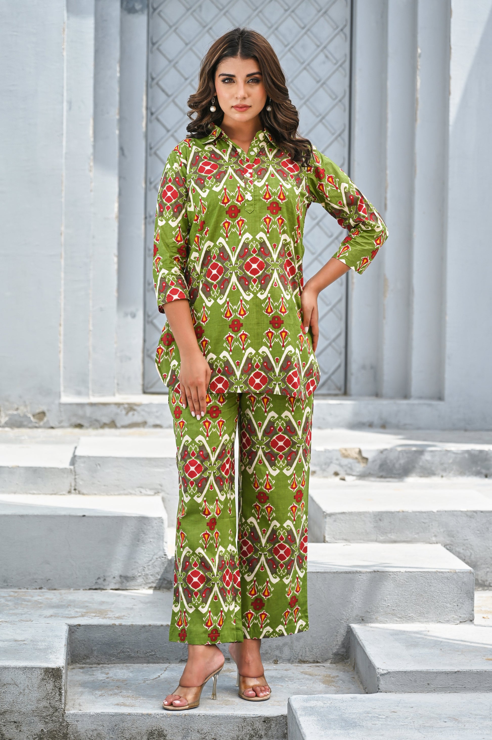 Step into effortless elegance with our Green Floral Printed Cotton Co-ord Set, designed for both comfort and style. Featuring a vibrant mix of red, yellow, and white motifs on a fresh green base, this set includes a straight-fit kurta with a collared neckline and 3/4 sleeves, paired with matching wide-leg pants. Crafted from breathable cotton, it’s perfect for casual outings, festive gatherings, or day-to-day wear. Pair with heels or flats for a chic, ready-to-go look.