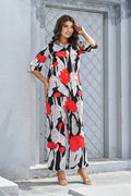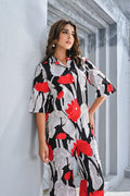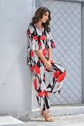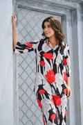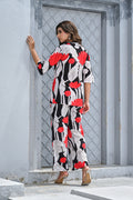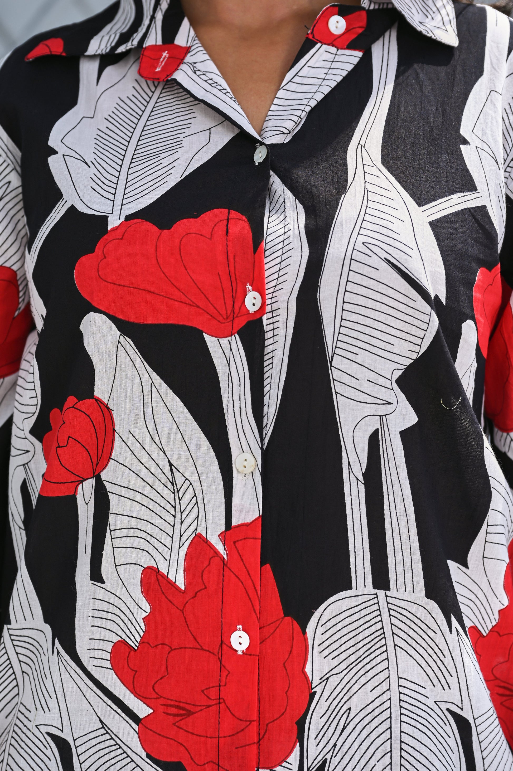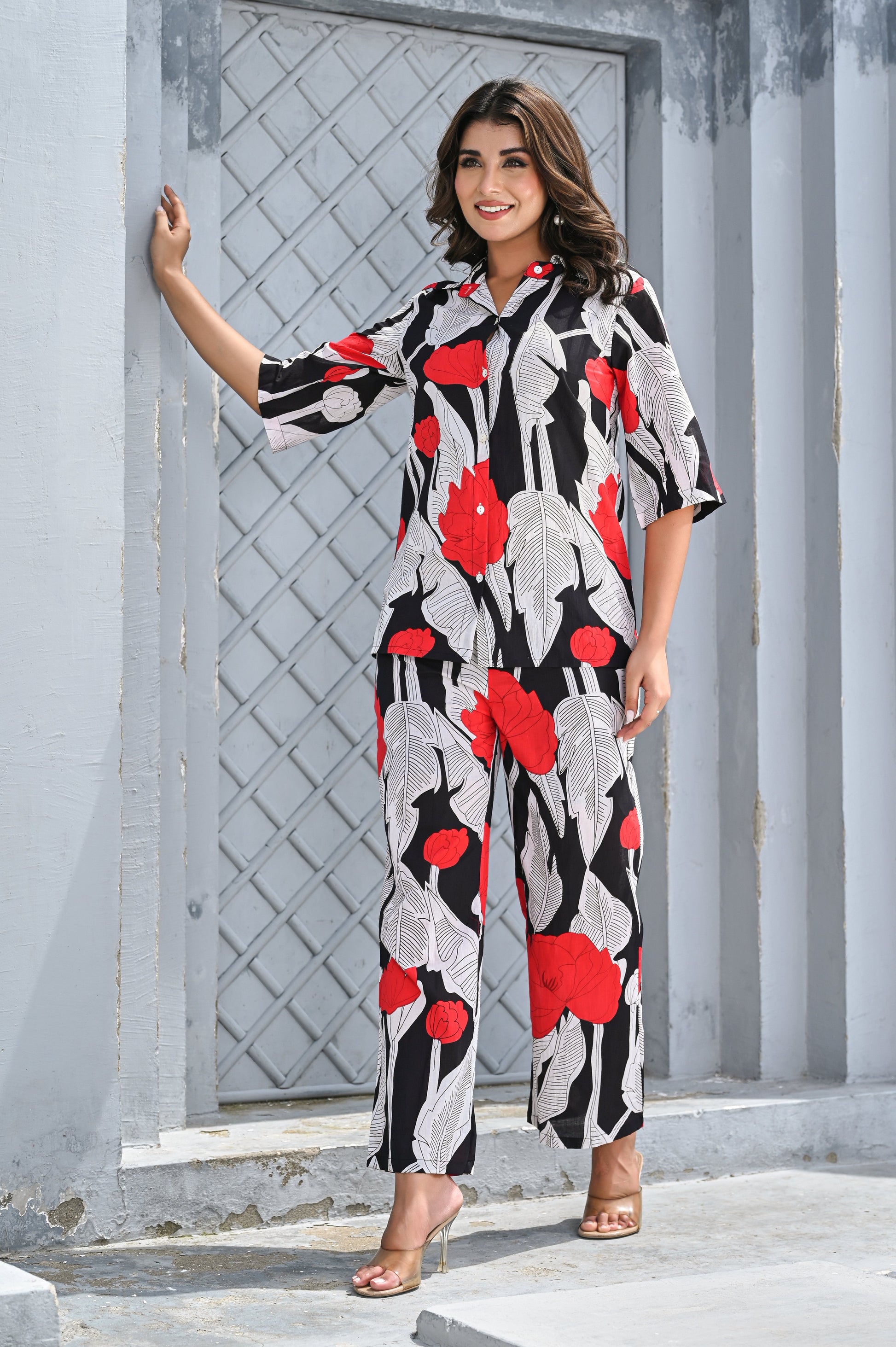 Make a bold fashion statement with this stunning black co-ord set, featuring vibrant red florals and elegant white leaf patterns. The relaxed-fit shirt with a button-down front pairs perfectly with flowy wide-leg pants, giving you both comfort and style. Perfect for vacations, brunch dates, or lounging in luxury.