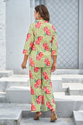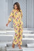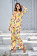 Bring a pop of sunshine to your style with our Yellow & White Stripe Papaya Print Co-ord Set. Designed with vibrant hand-painted style papaya motifs over cheerful yellow and white stripes, this set blends tropical fun with everyday wearability. The breezy button-down shirt with 3/4th sleeves and the matching relaxed-fit pants make it perfect for brunches, vacations, or lounging in style.