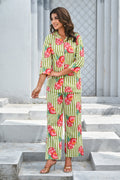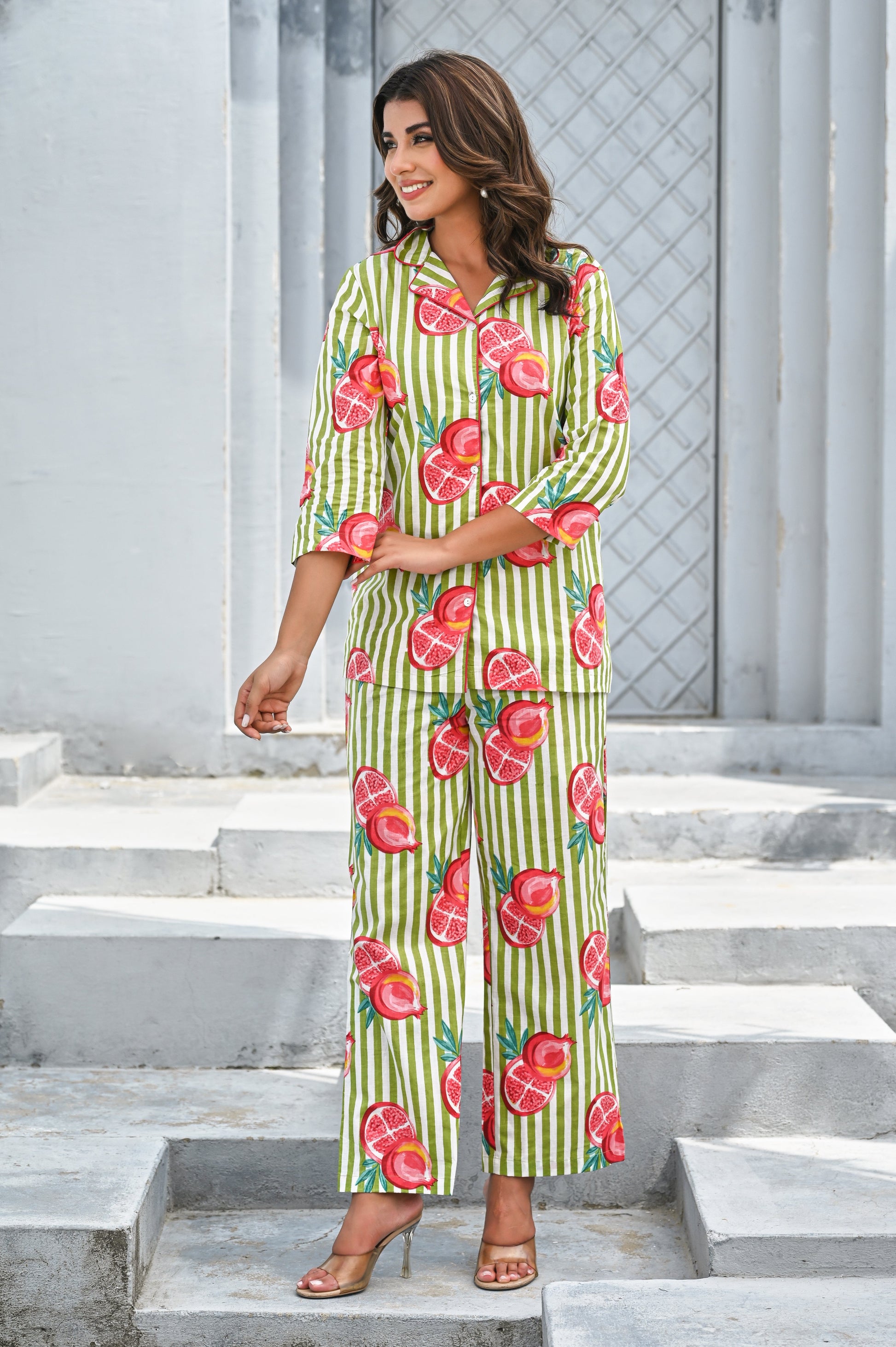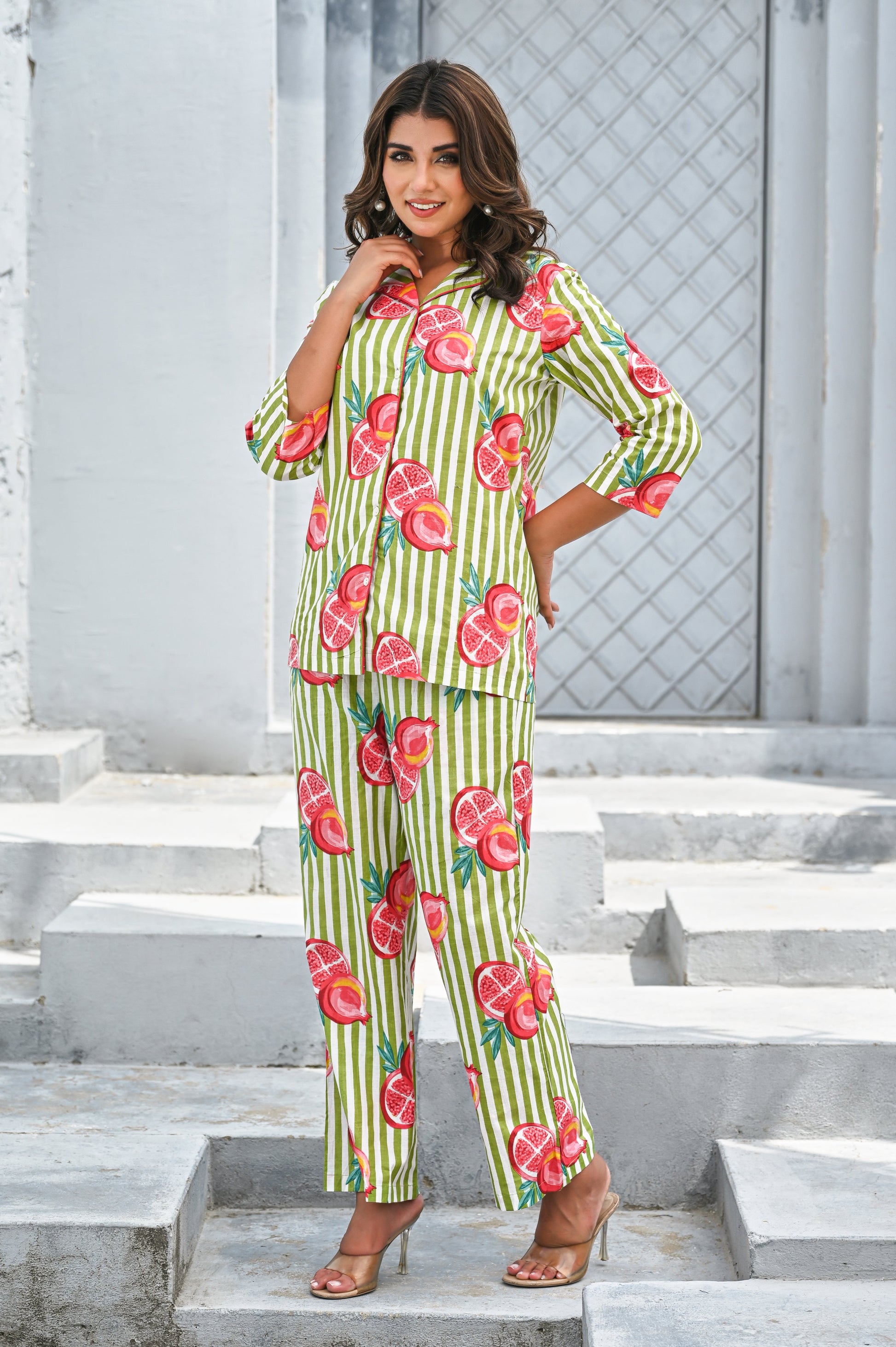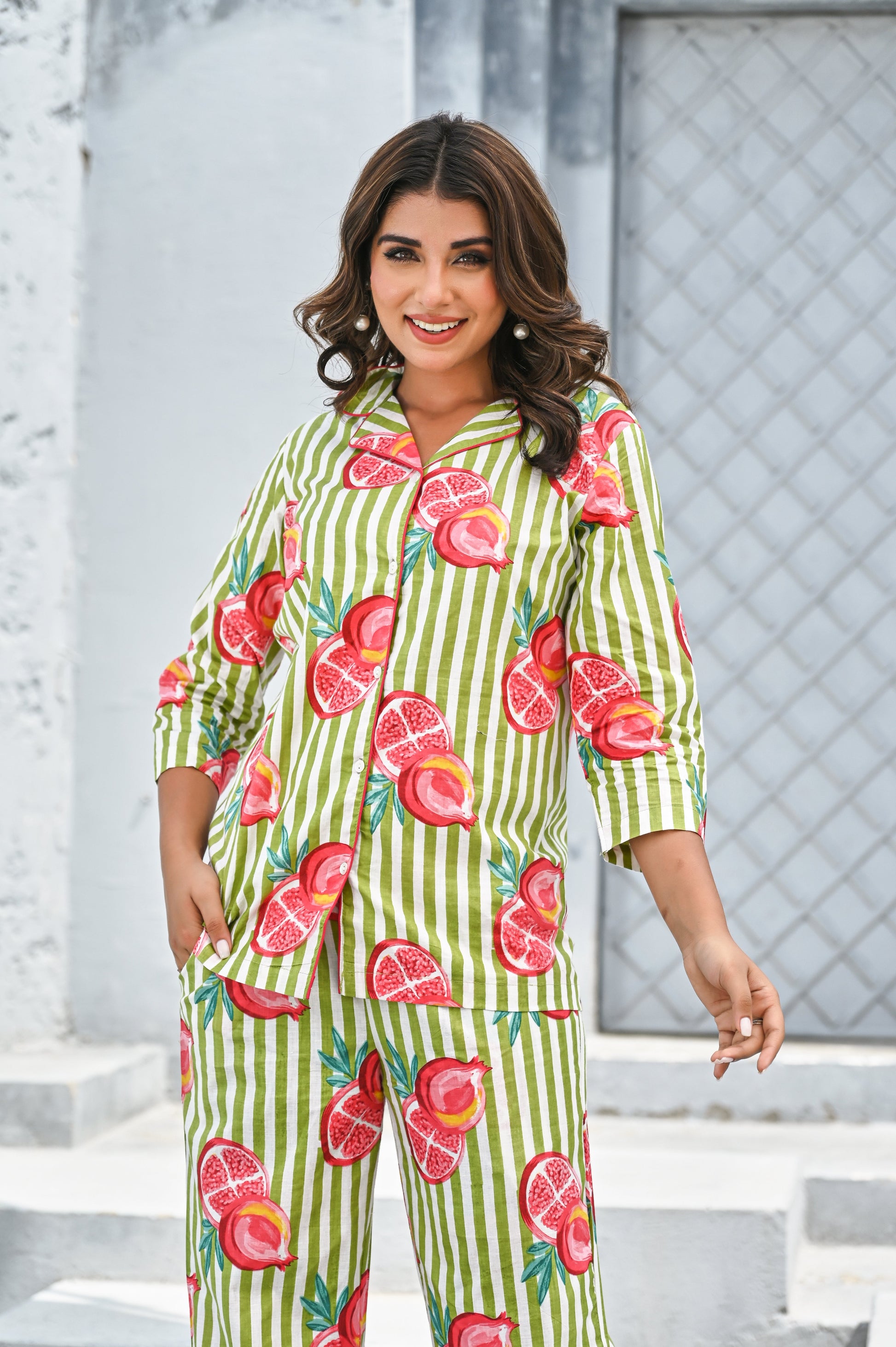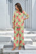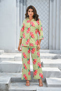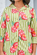 Refresh your wardrobe with our Green & Pink Pomegranate Print Co-ord Set. Featuring playful hand-painted style pomegranate motifs over vertical green and white stripes, this set radiates a fresh, summer-ready vibe. The breezy button-down shirt with 3/4th sleeves pairs perfectly with relaxed-fit pants for a look that’s equal parts fun and comfortable. Perfect for casual brunches, beach vacations, or lounging in style.