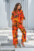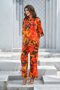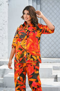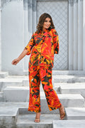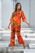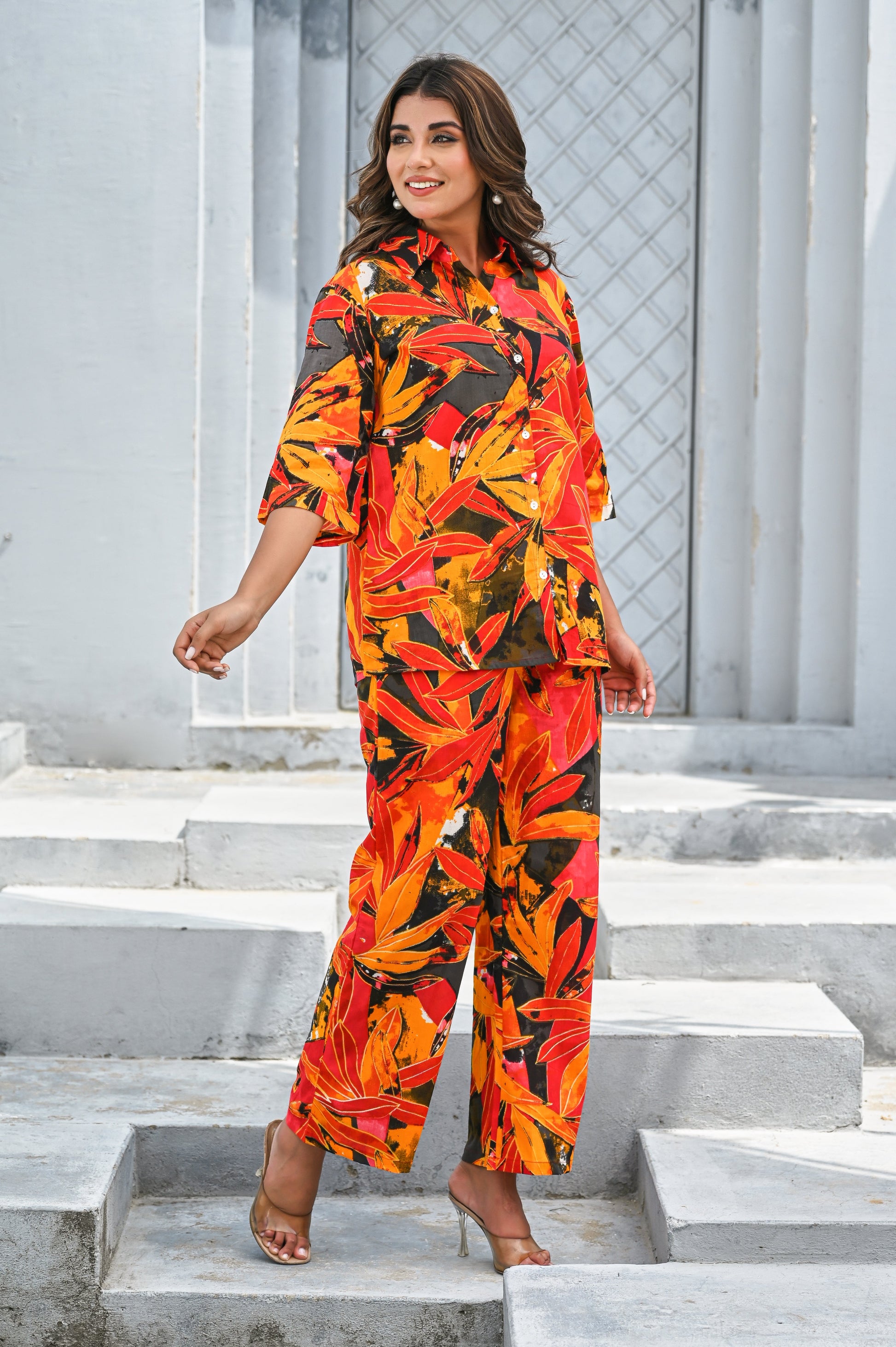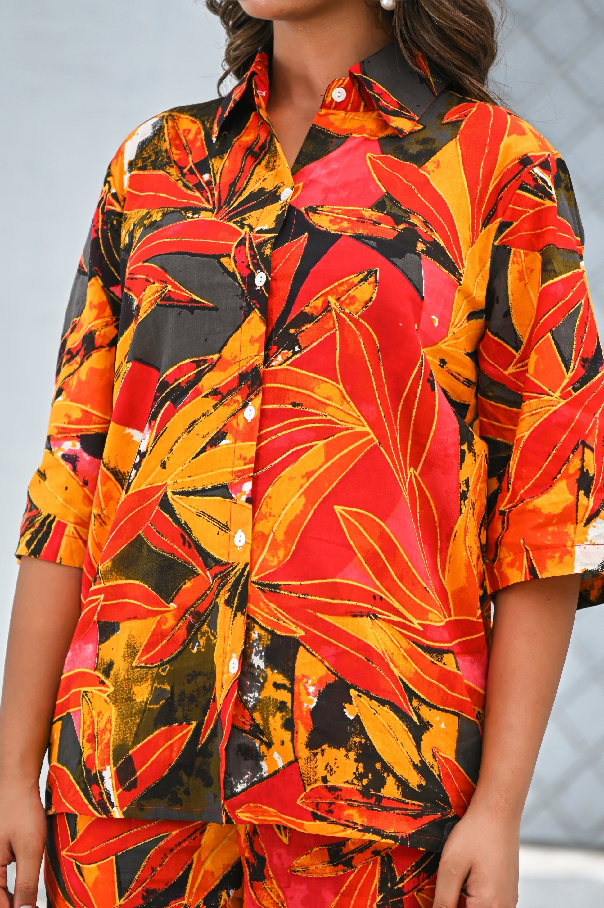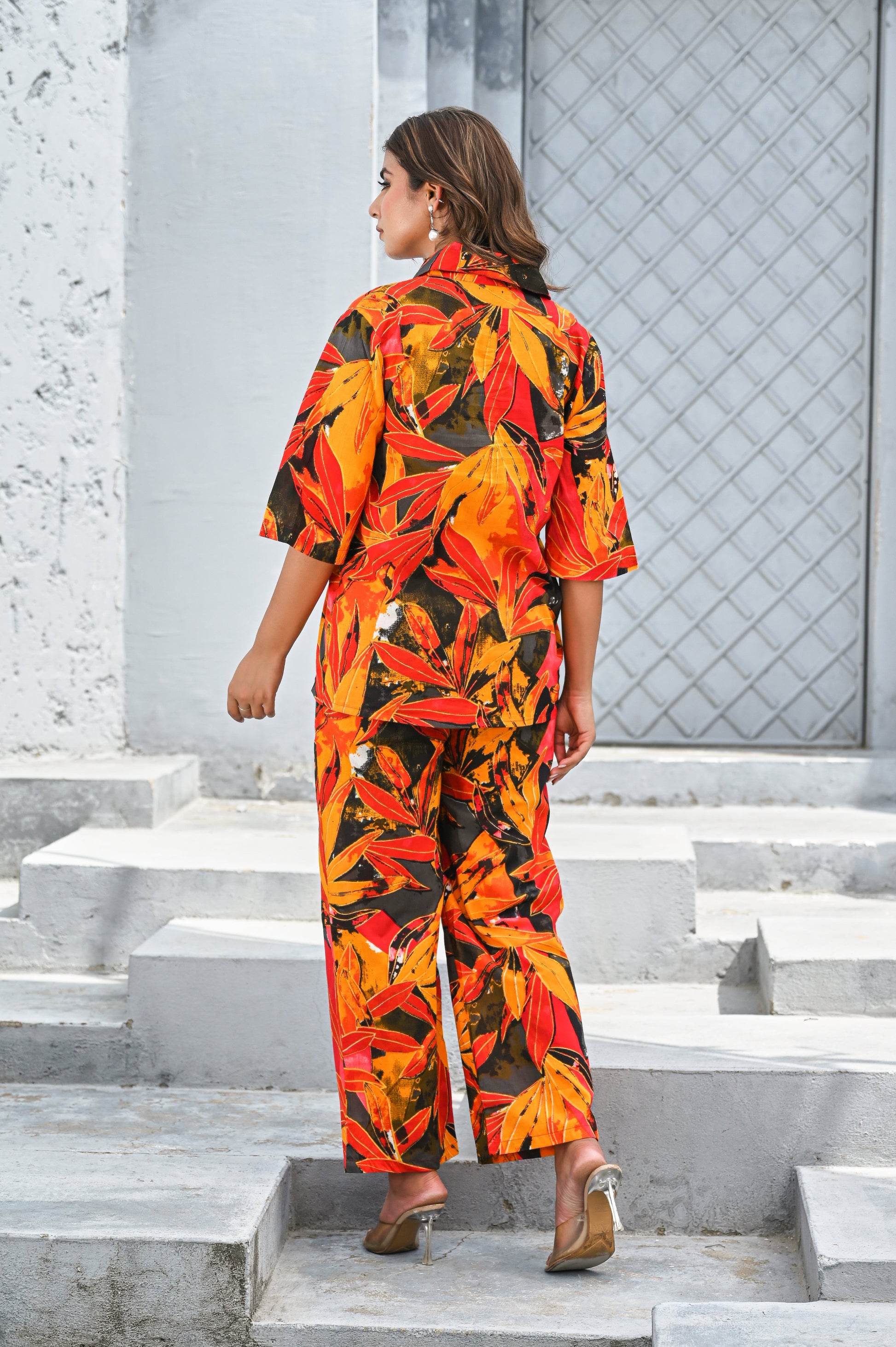 Turn up the heat with our Tropical Orange & Red Leaf Print Co-ord Set. Featuring a striking blend of fiery orange, deep red, and hints of black, this two-piece set is perfect for making a bold, confident style statement. The relaxed button-down shirt with elbow-length sleeves pairs effortlessly with wide-leg pants for a look that’s both eye-catching and comfortable. Ideal for vacations, brunch dates, or evening getaways.