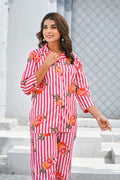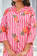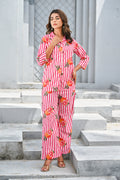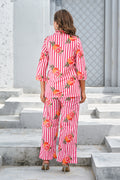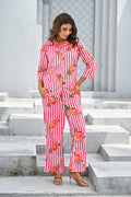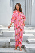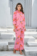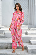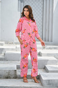 Bright, fresh, and full of energy — our Pink & White Striped Citrus Print Co-ord Set is perfect for those who love to make a bold style statement. Featuring a button-down shirt with 3/4th sleeves and matching wide-leg pants, this vibrant set combines playful fruit motifs with classic stripes for a fun and chic look. Ideal for vacations, brunches, or casual summer outings.