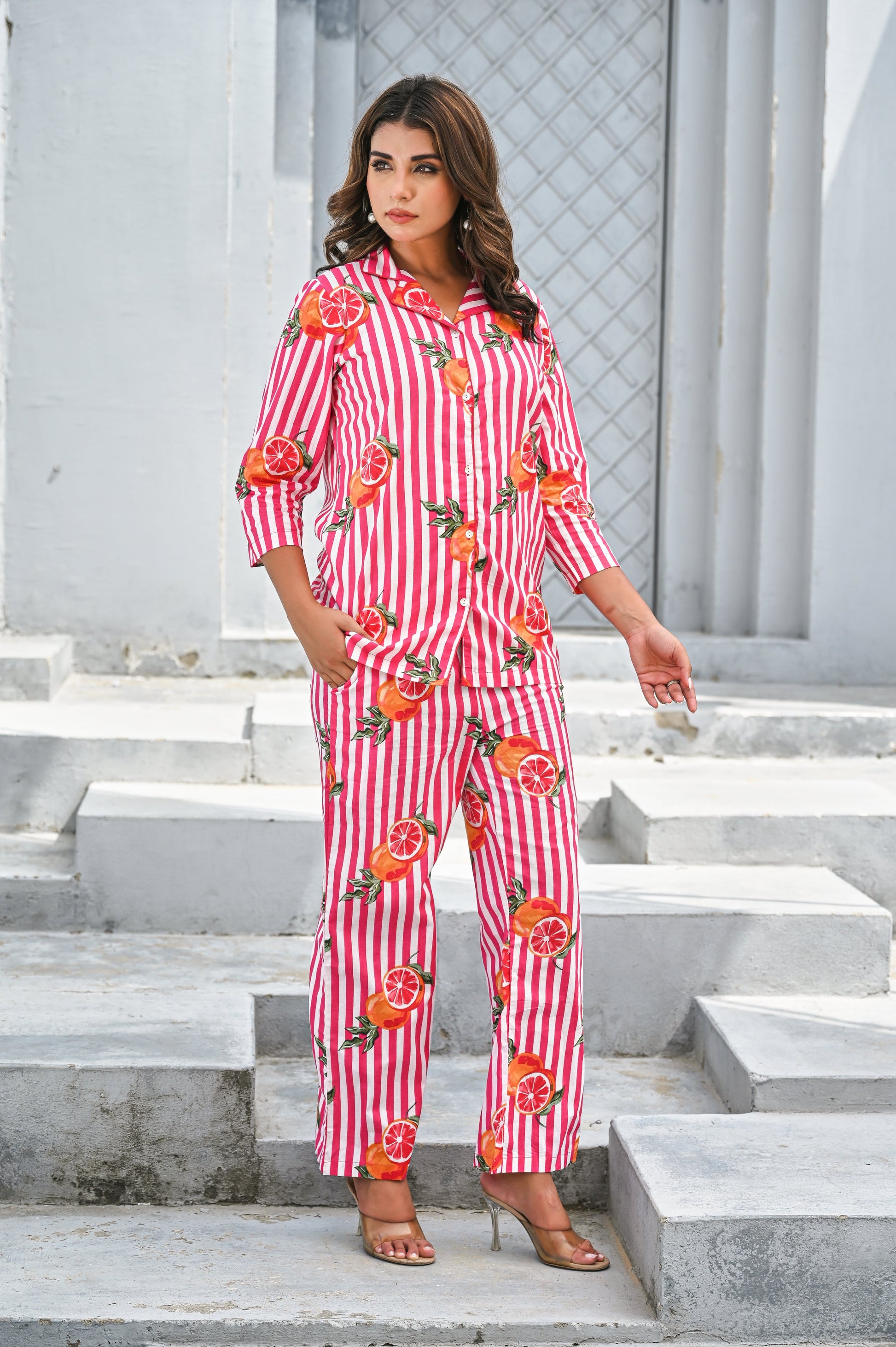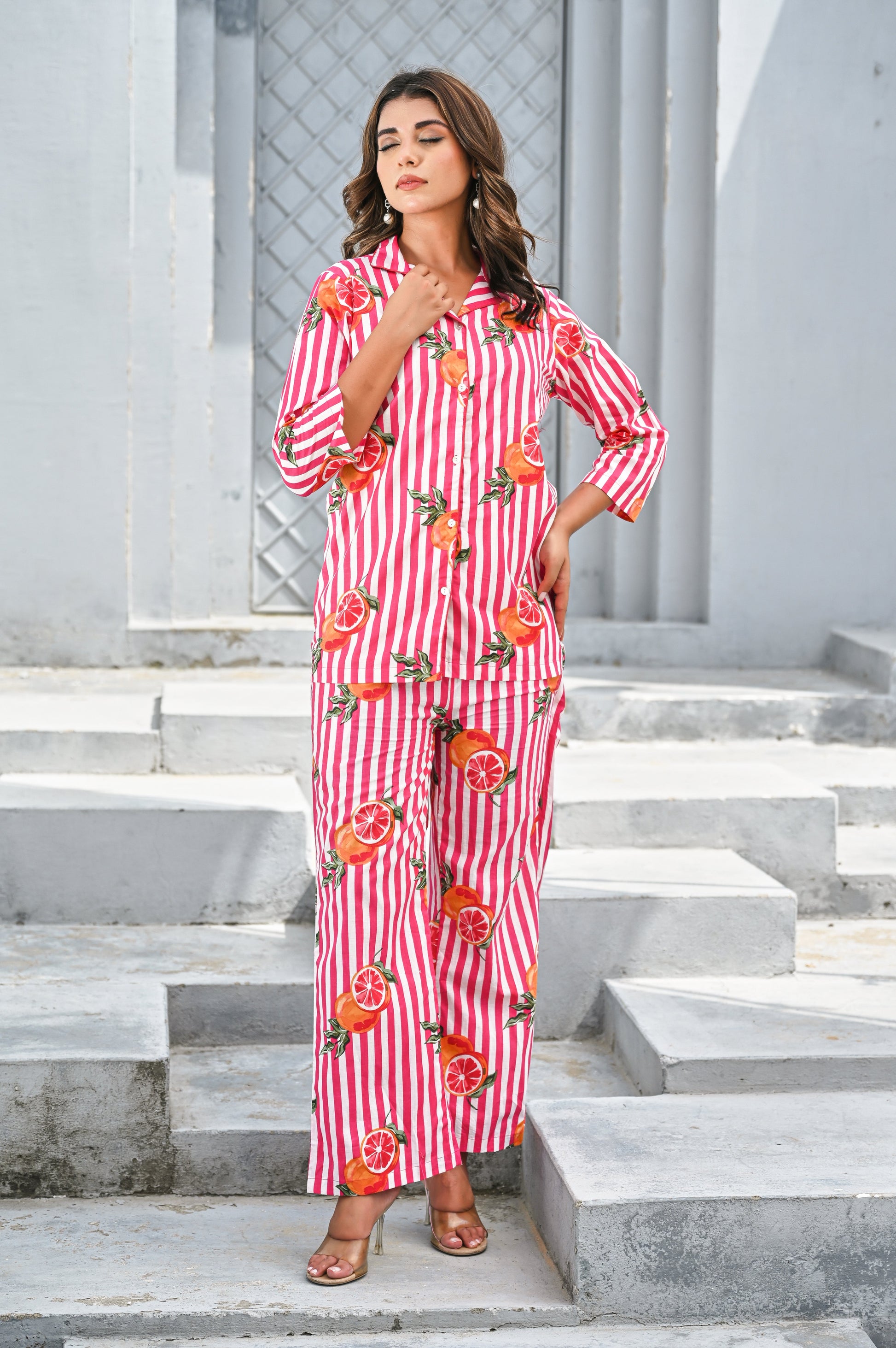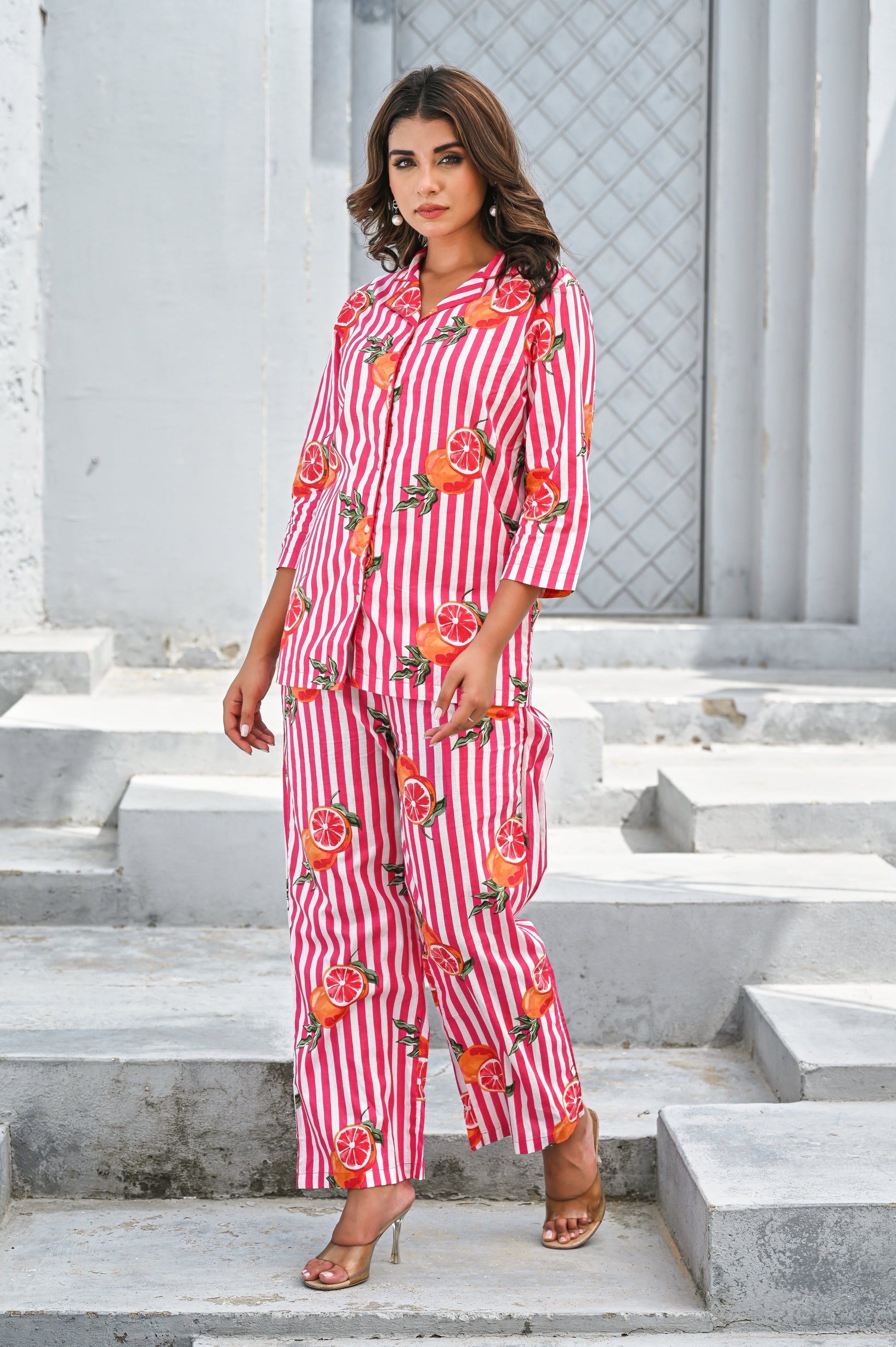 Women’s Pink & White Striped Citrus Print Co-ord Set