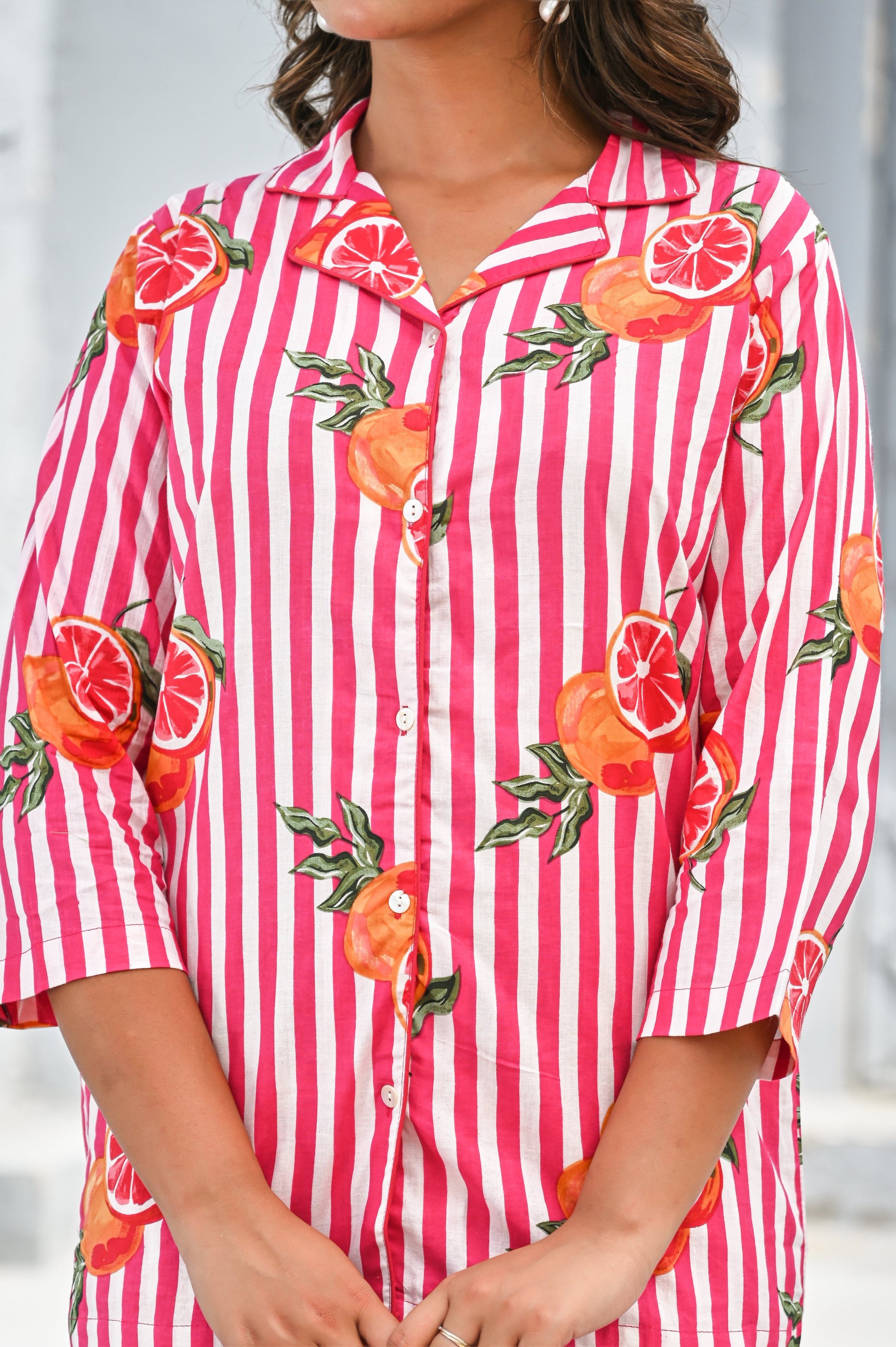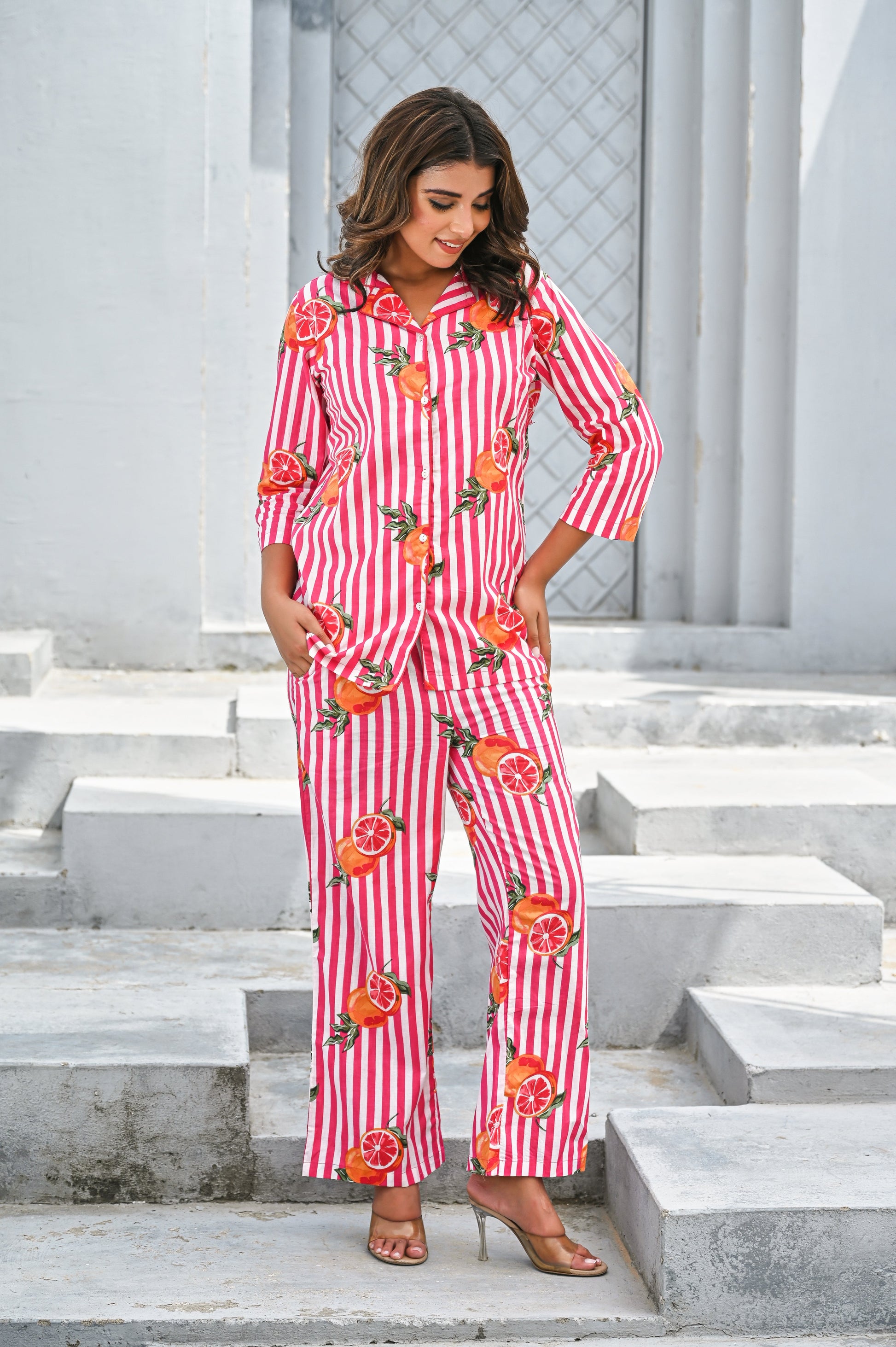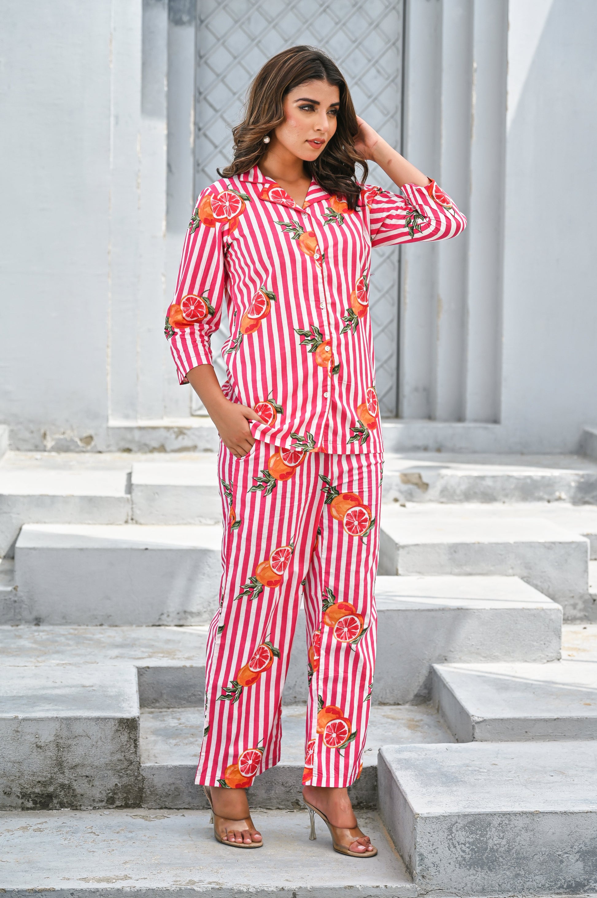 Women’s Pink & White Striped Citrus Print Co-ord Set