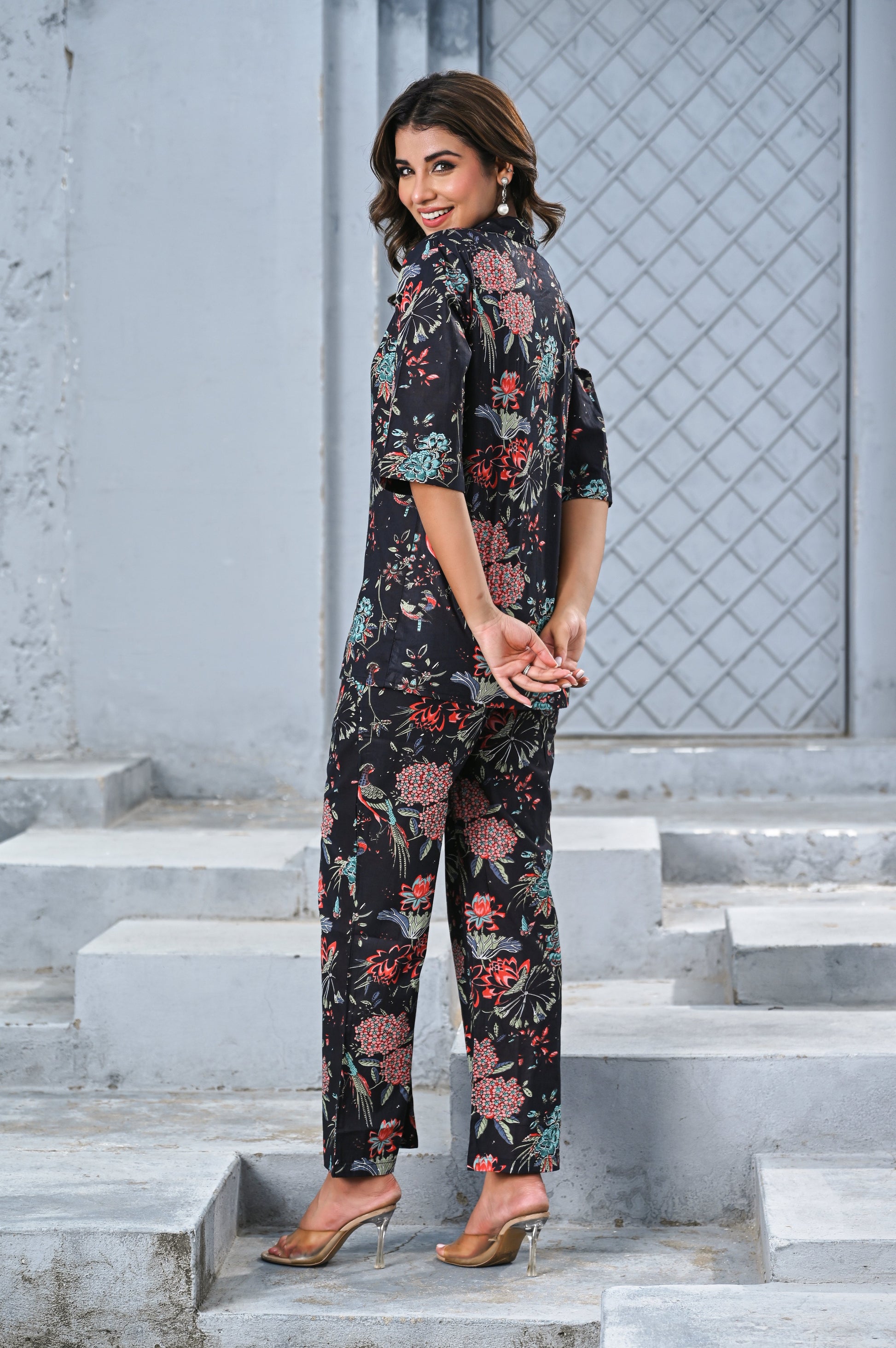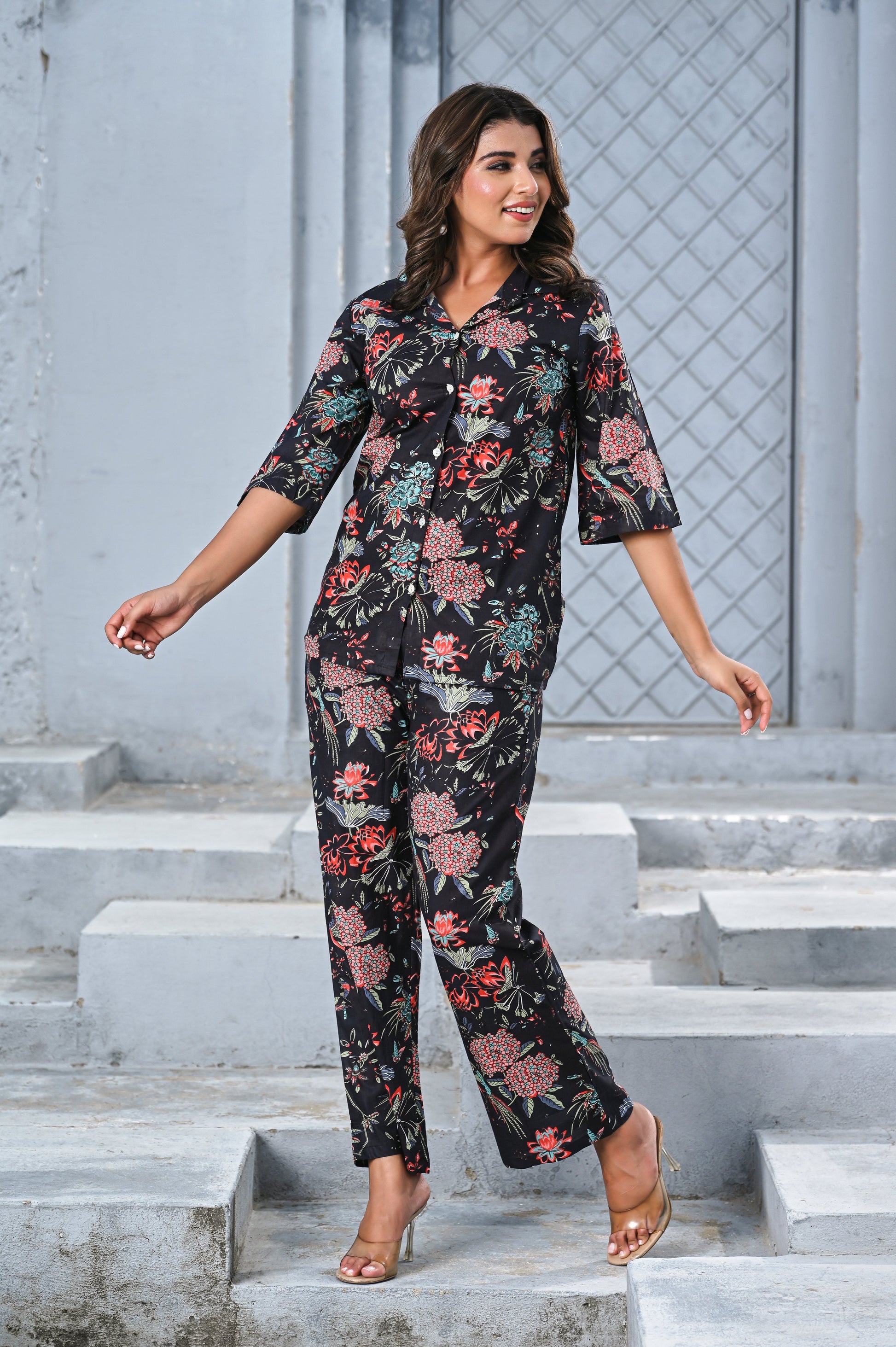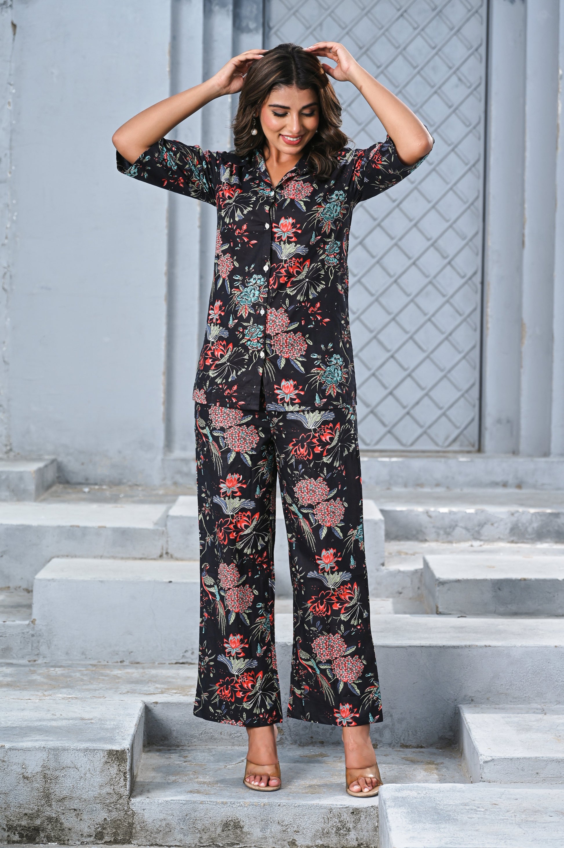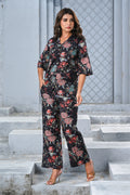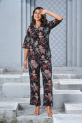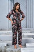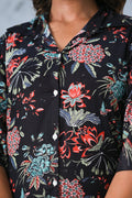 Step into effortless elegance with our Black Floral Print Co-ord Set. Crafted with a soft, breathable fabric, this two-piece set features a button-down shirt with 3/4th sleeves and relaxed-fit wide-leg pants. The vibrant floral design on a black base creates the perfect balance of sophistication and charm, making it ideal for brunches, vacations, or casual outings.