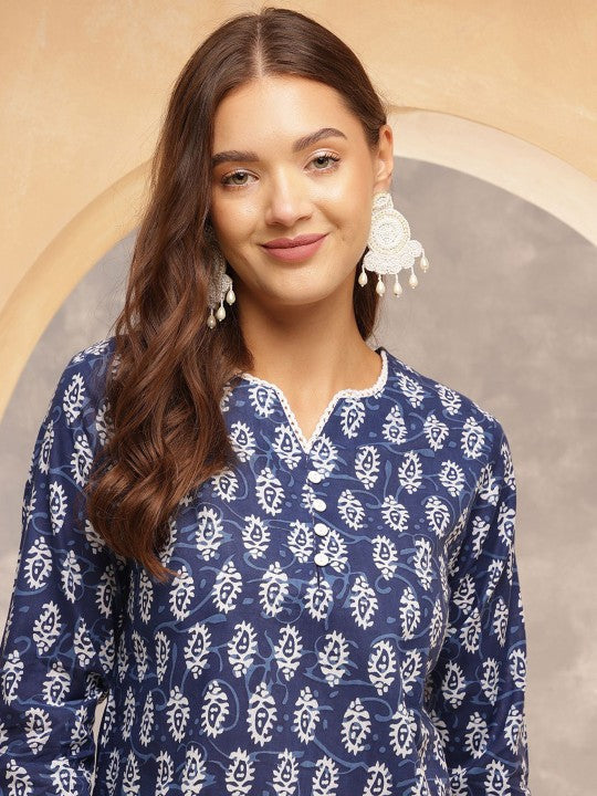 Classic, clean, and effortlessly stylish—the Indigo Charm Cotton Tunic is a timeless staple for every wardrobe. Made from soft and breathable cotton, this tunic features a rich navy blue base with traditional white handblock-style floral motifs, giving it a handcrafted and elegant look.