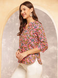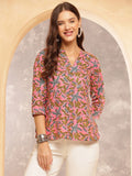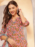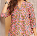 Blossom Breeze Cotton Tunic Top – Pink & Multi Leaf Print