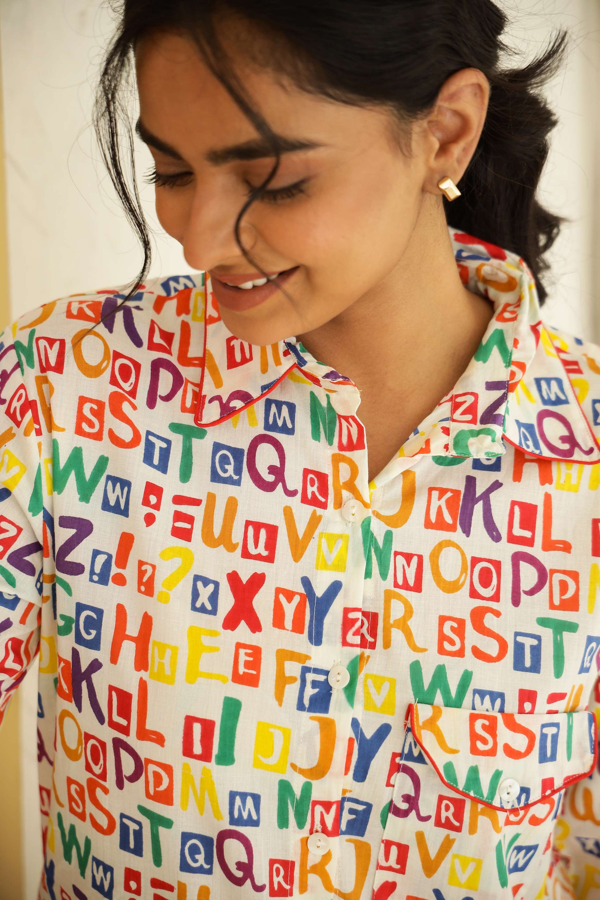 Add a playful twist to your everyday wardrobe with our Multicolour Alphabet Print Cotton Co-Ord Set. Bursting with vibrant letters in a rainbow of colors, this quirky set is perfect for those who love to stand out while staying ultra-comfy.