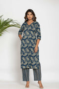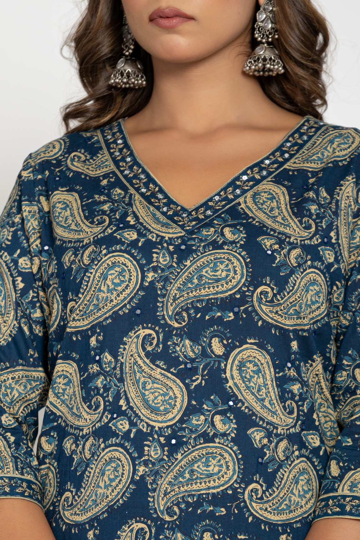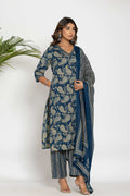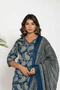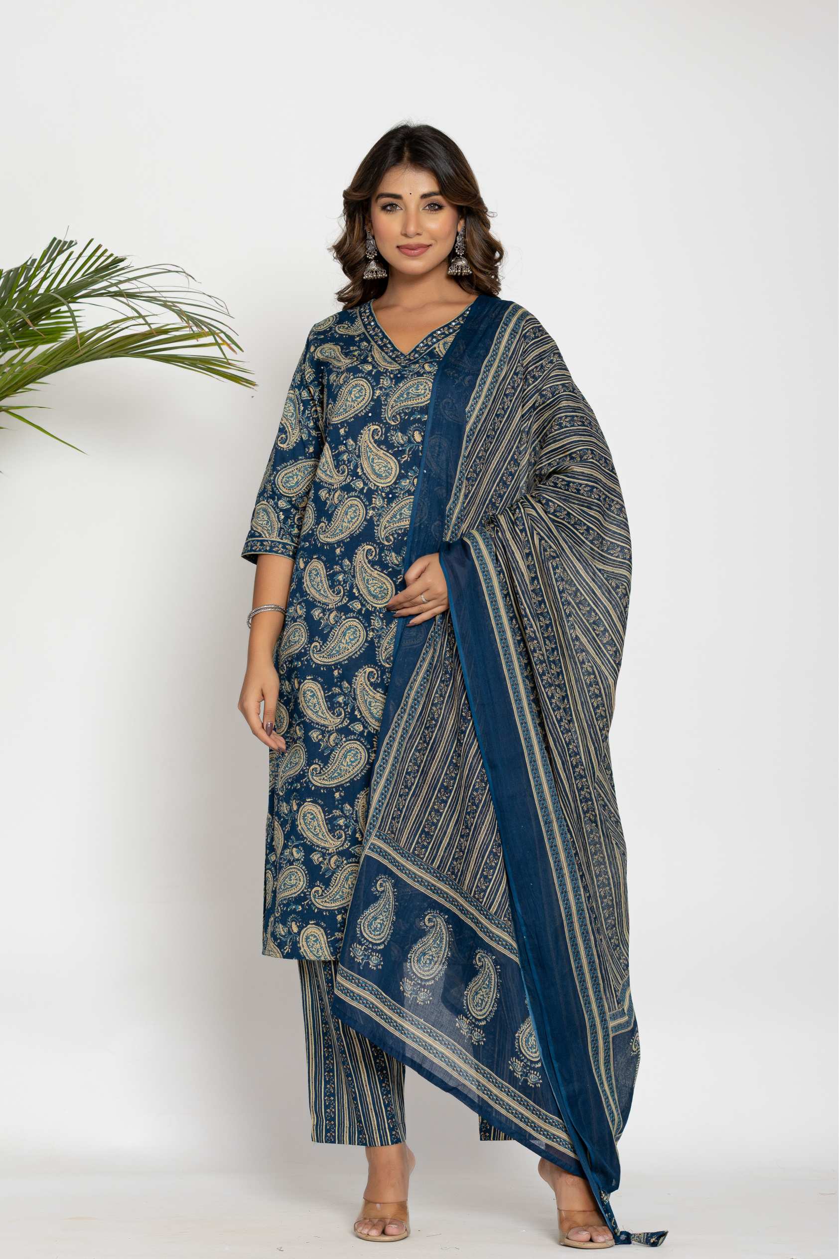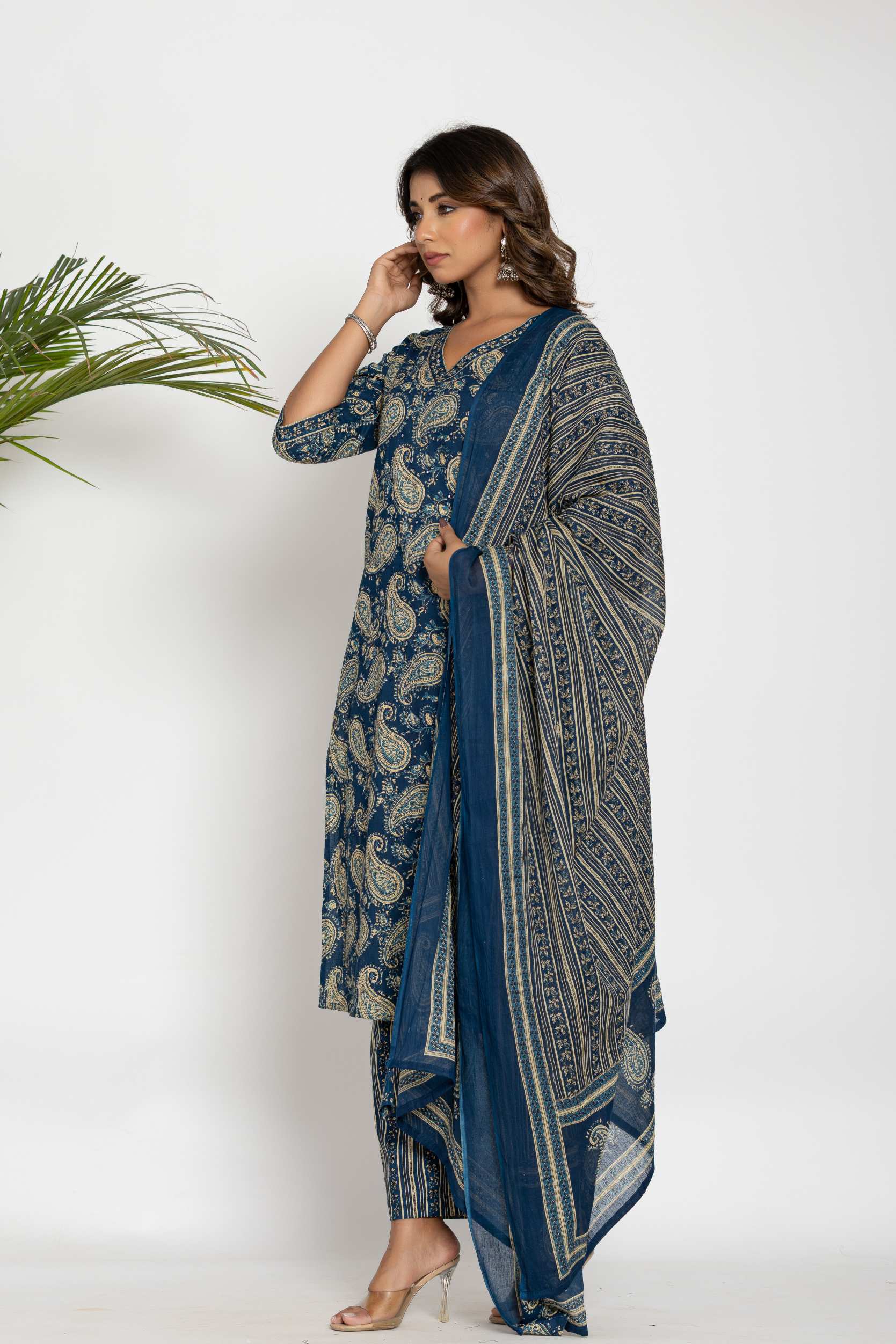 Navy Blue & Beige Paisley Printed Cotton Suit Set - Kurti, Pant & Dupatta