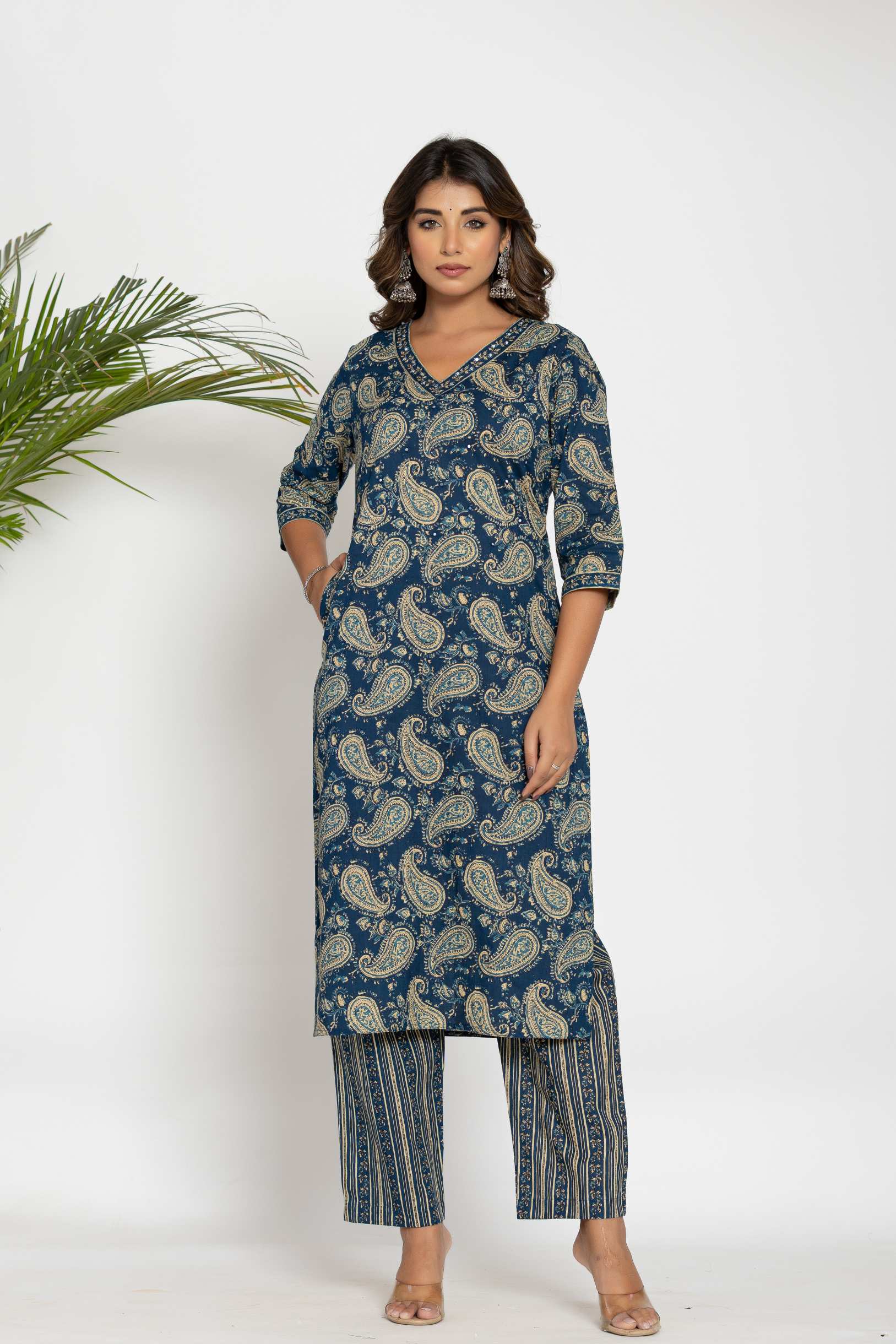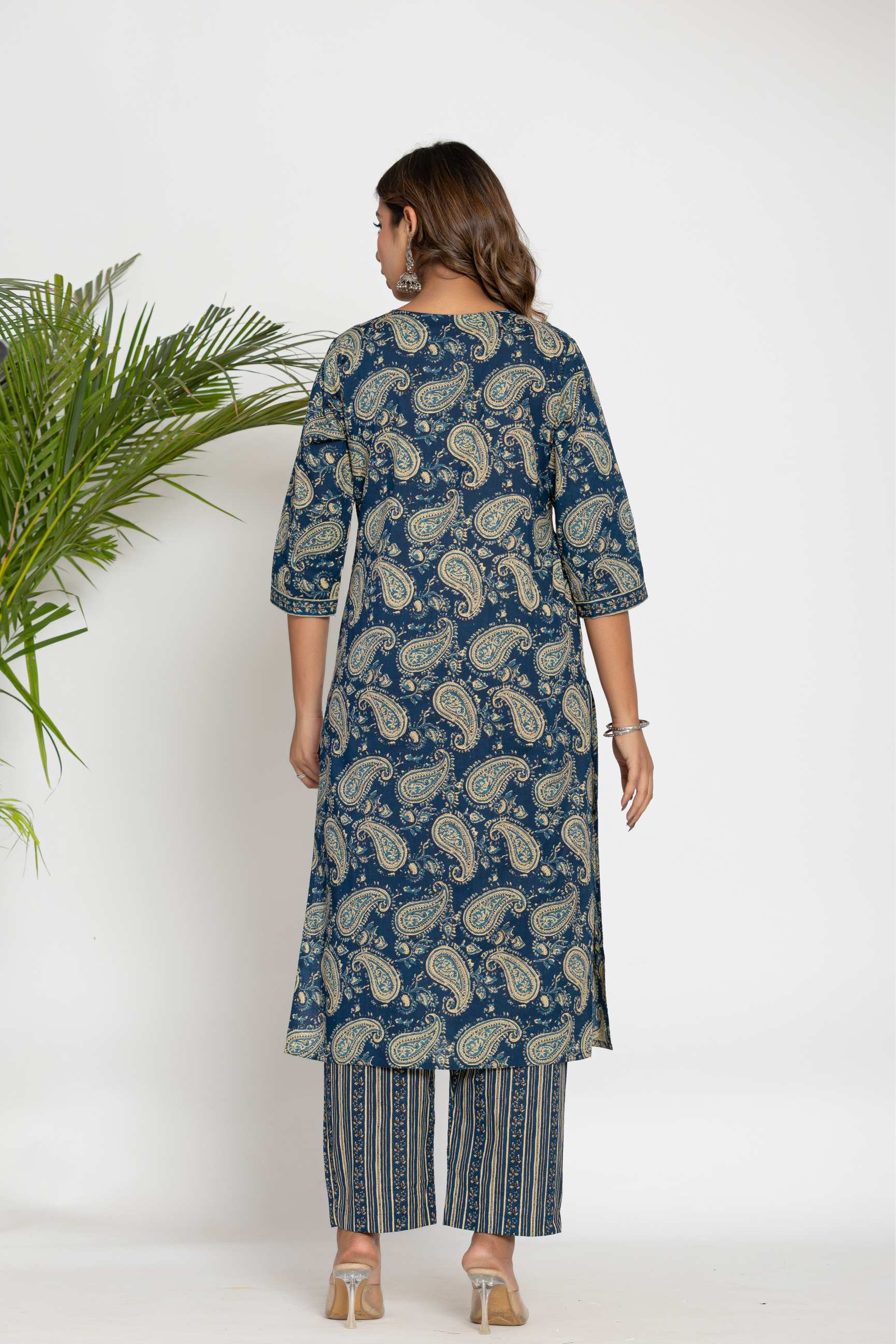 Step into elegance with this stunning navy blue paisley printed cotton suit set, perfect for casual outings, office wear, and festive gatherings. The soft cotton fabric ensures all-day comfort, while the intricate prints add a timeless ethnic charm.