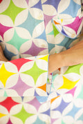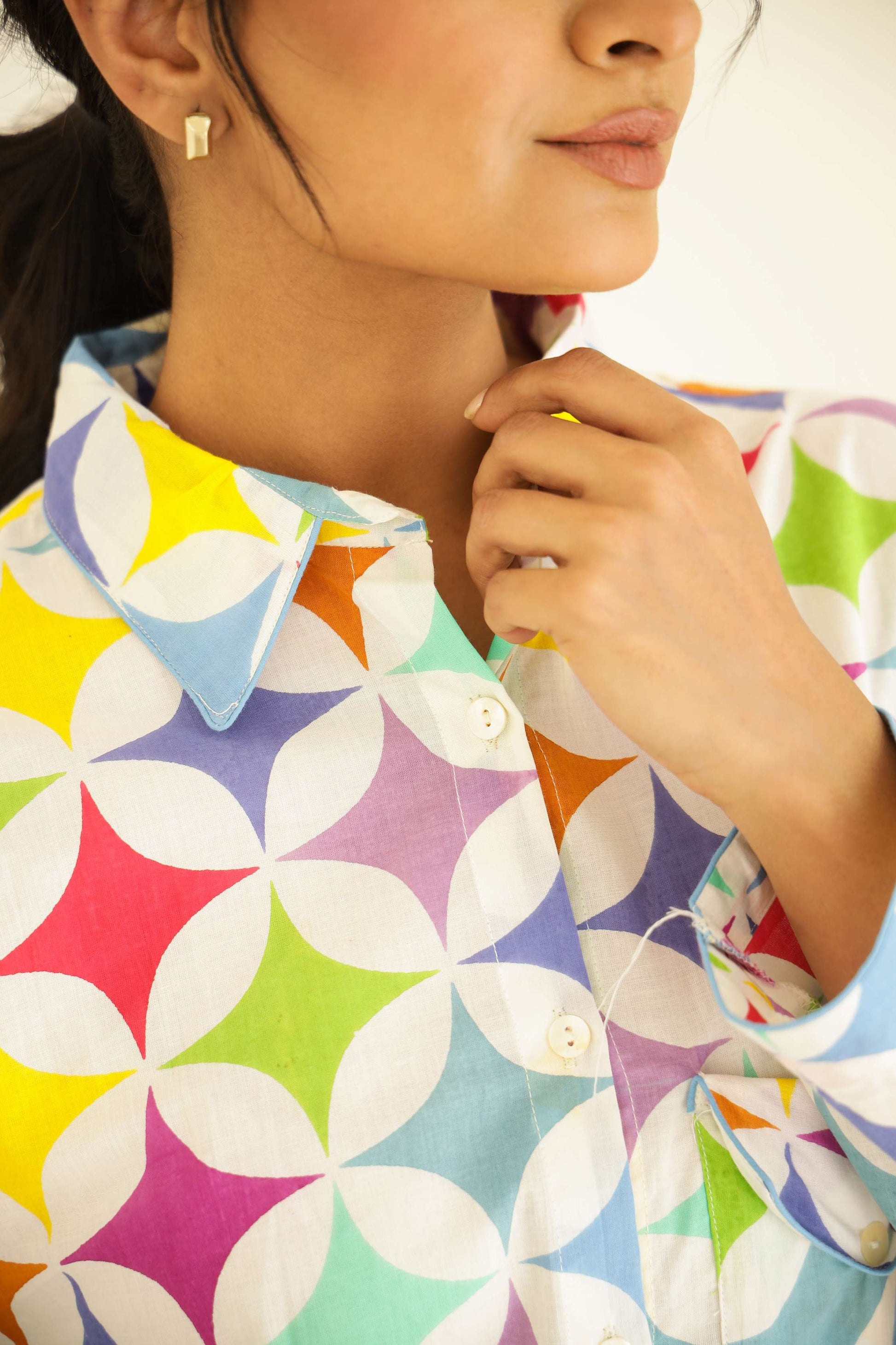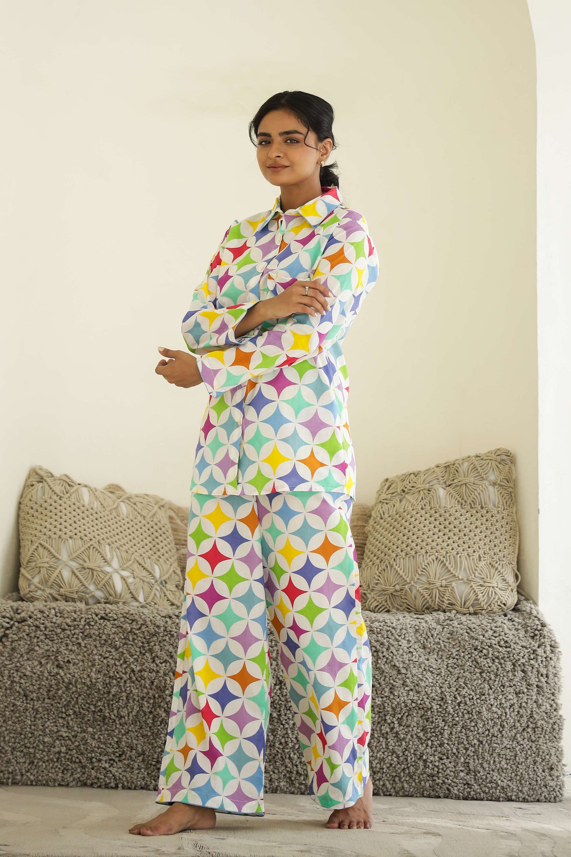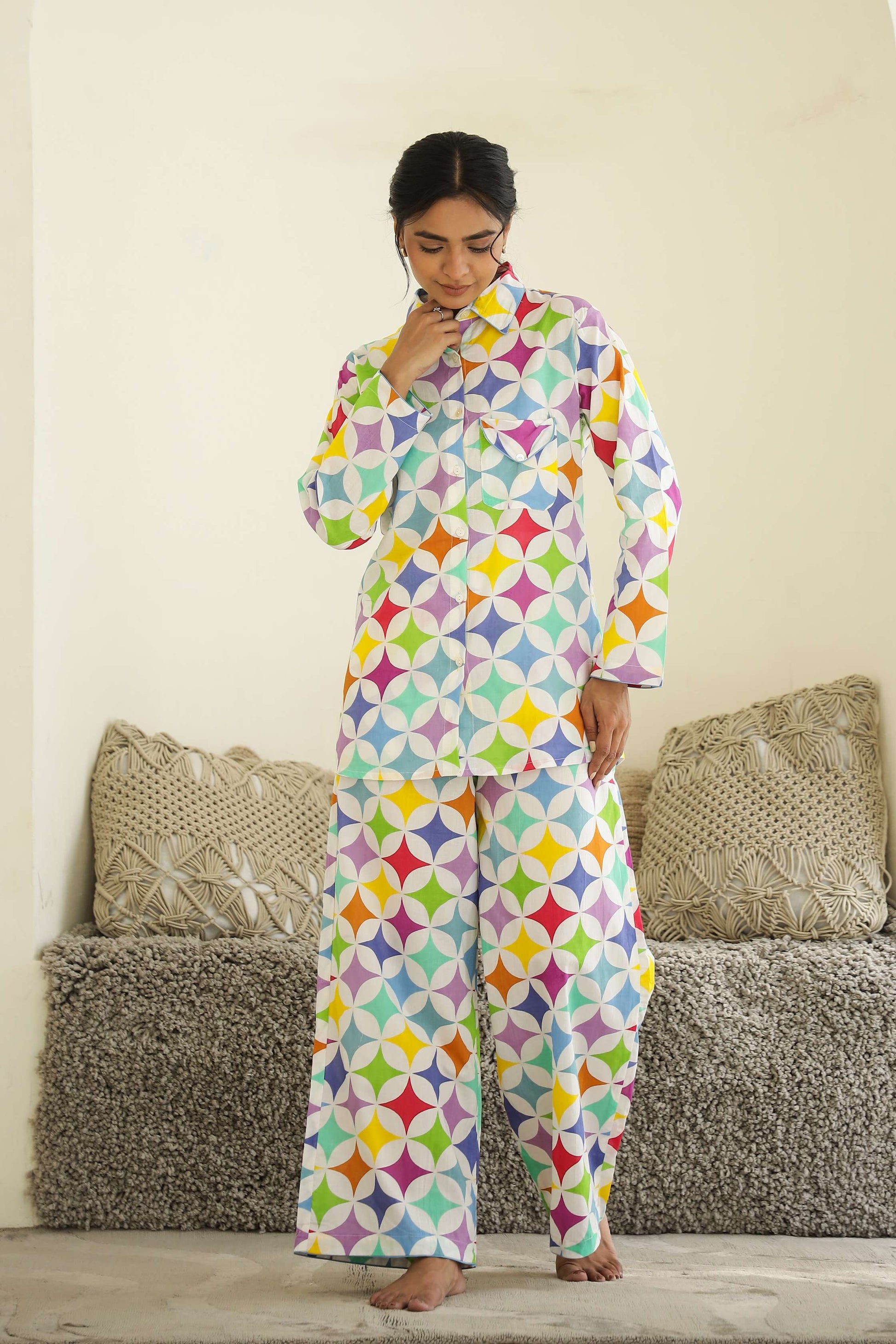 Step into a world of color with our Rainbow Geometry Print Cotton Co-Ord Set, designed for those who love playful patterns and relaxed fits. This vibrant ensemble features a kaleidoscope of bold geometric shapes, blending bright hues into a contemporary statement piece.