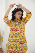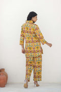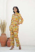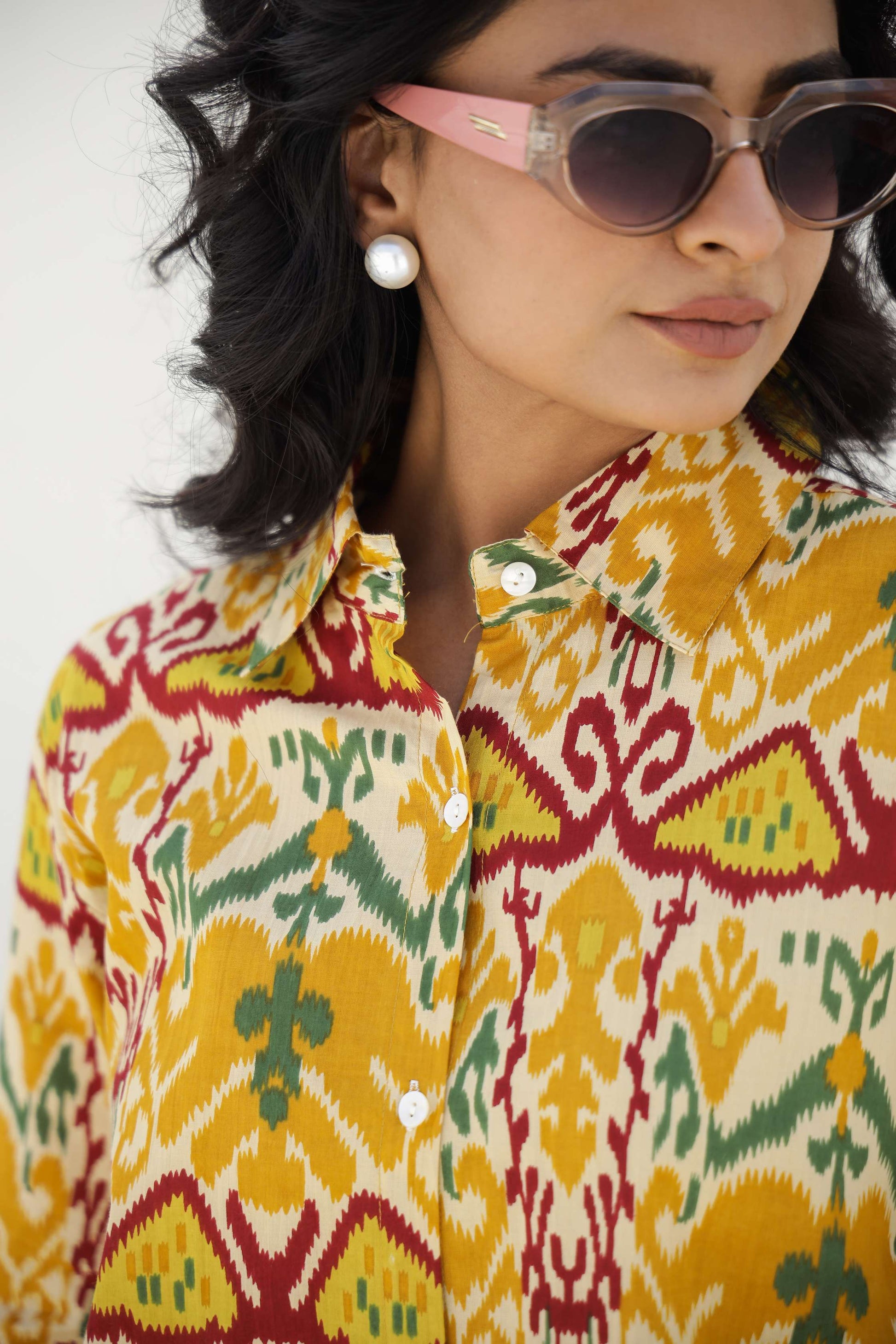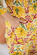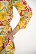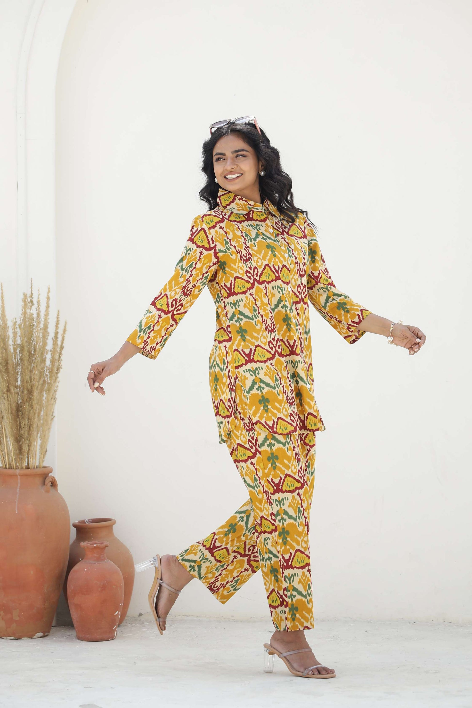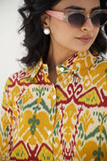 Brighten up your wardrobe with this Sunburst Ikat Print Cotton Co-Ord Set, blending traditional patterns with contemporary comfort. Featuring a vibrant yellow base with bold red and green ikat-inspired motifs, this set brings playful energy and artisanal charm to your everyday style.