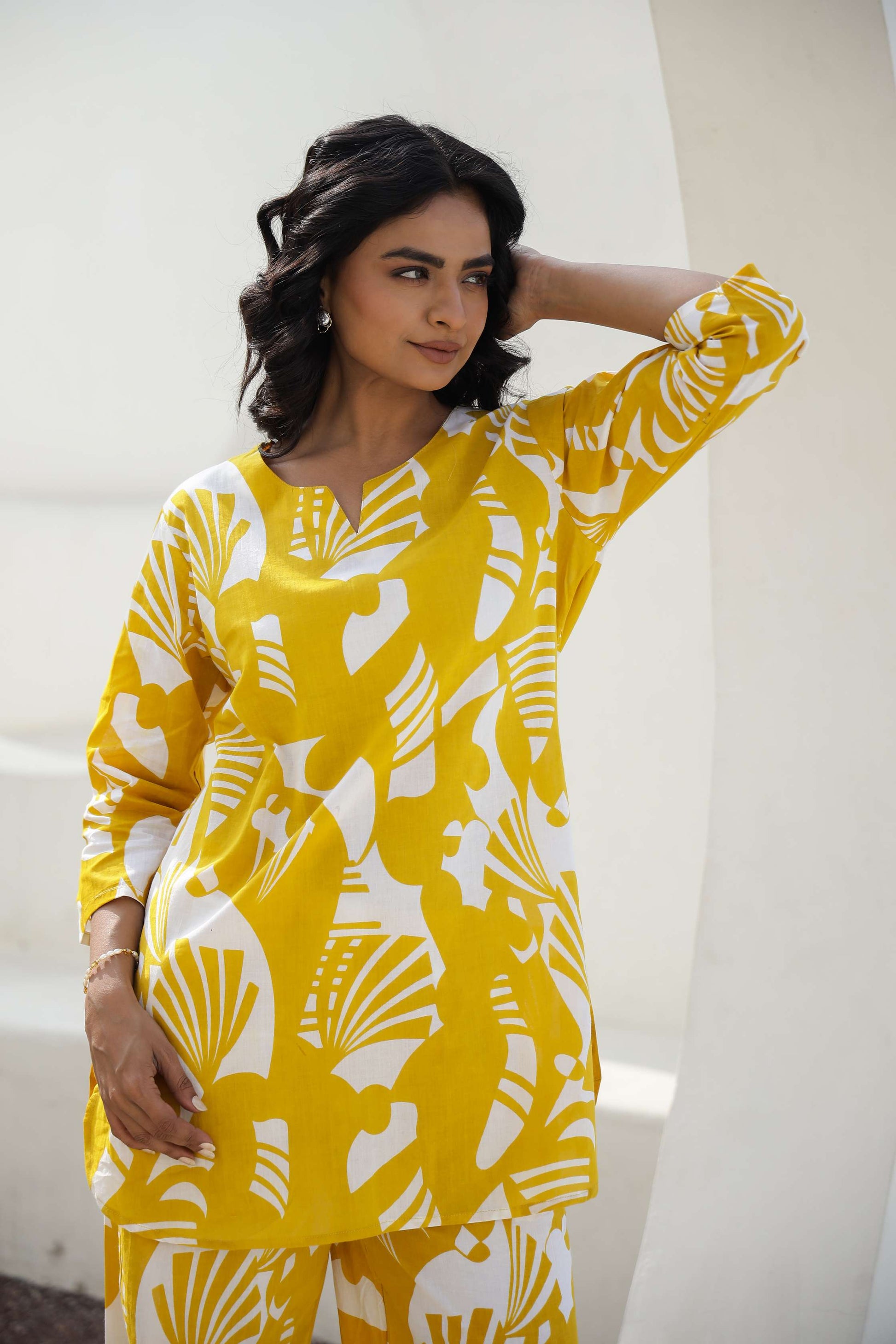 Brighten up your wardrobe with this Sunny Yellow Abstract Cotton Cord Set. Made from soft, breathable cotton, this vibrant co-ord set features a playful abstract print in fresh white on a bold yellow base. The set includes a relaxed-fit kurta top and straight-leg trousers, perfect for sunny day outings, casual brunches, or vacation styling.