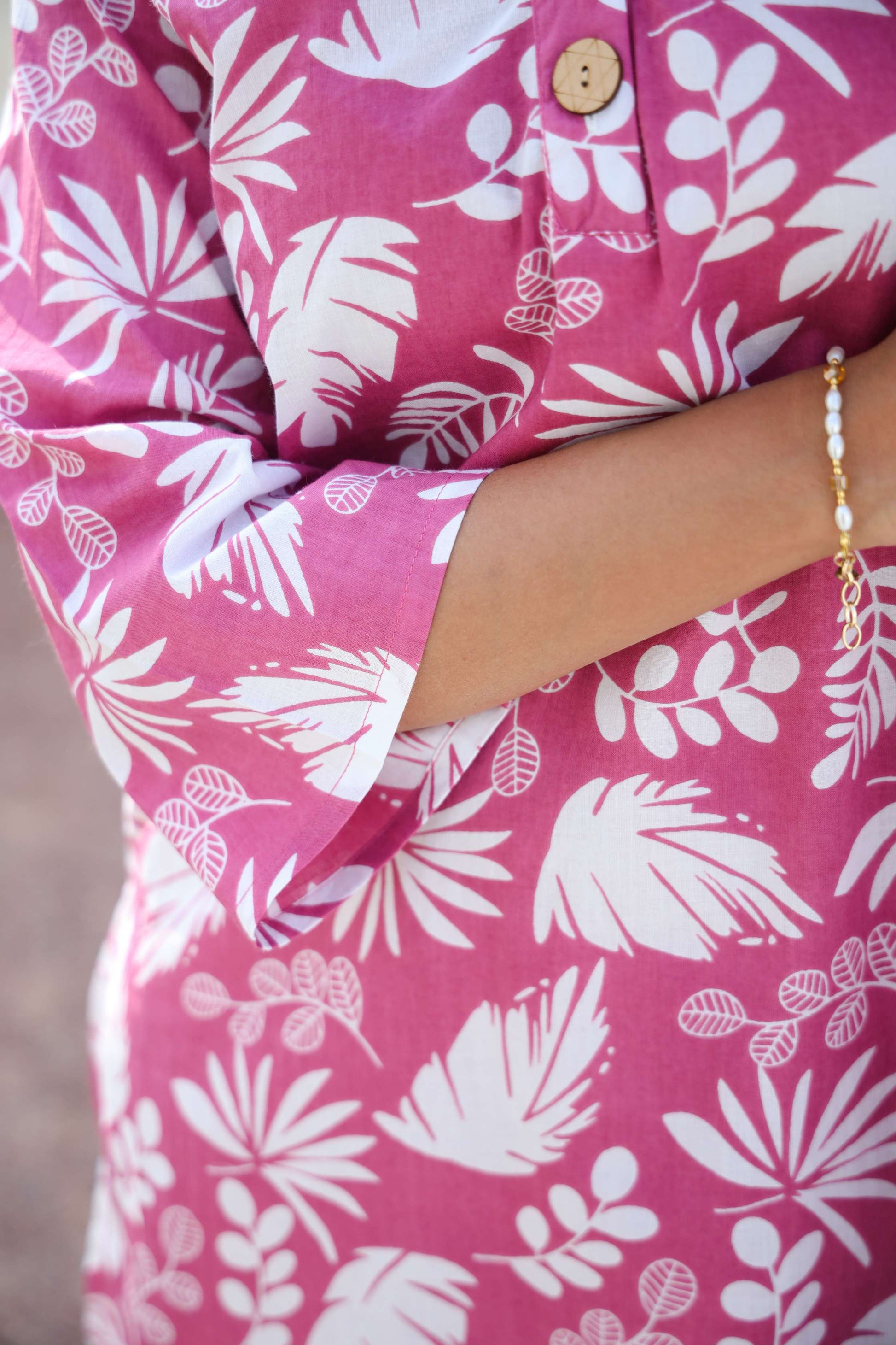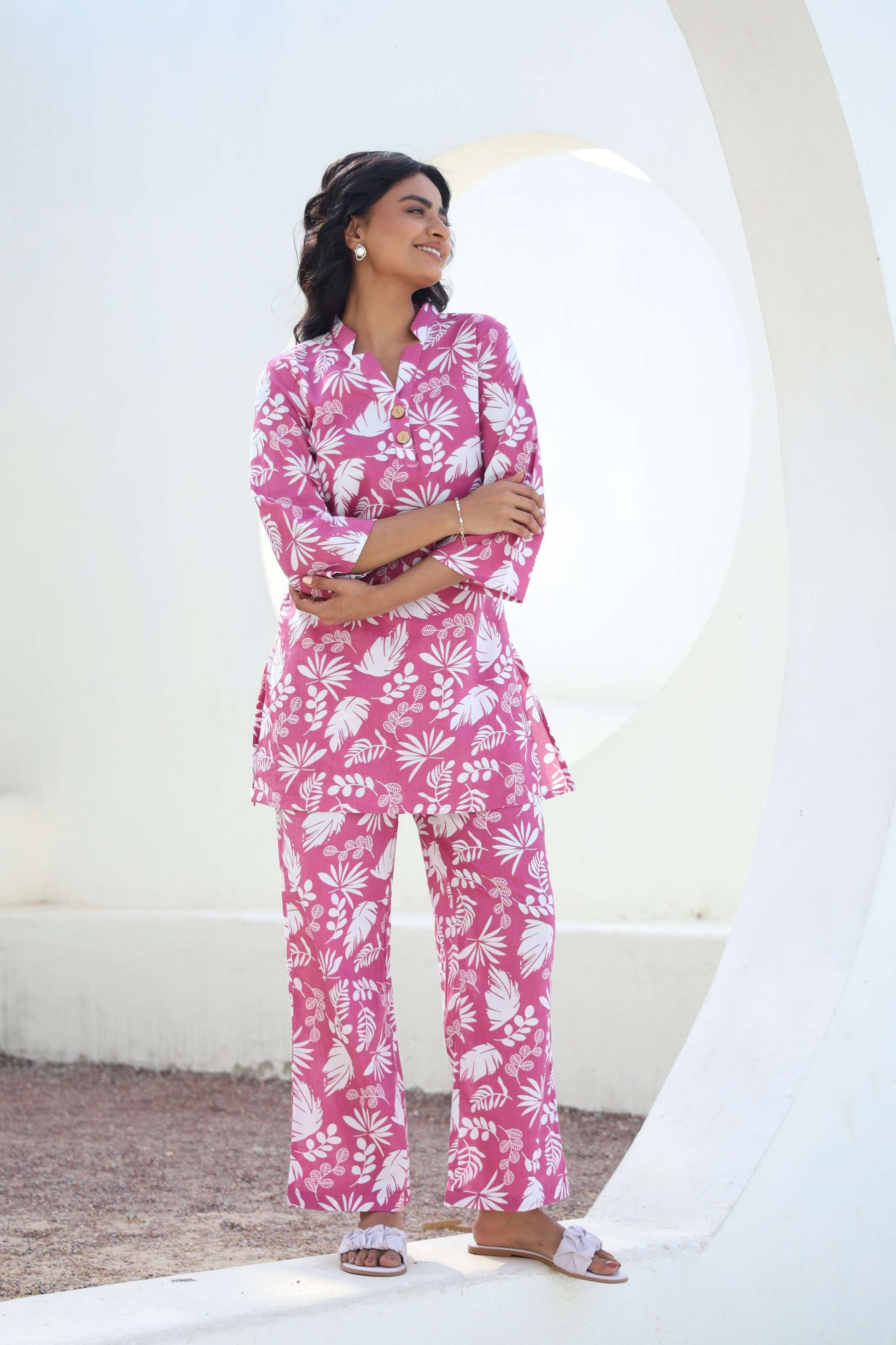 Upgrade your wardrobe with our Tropical Printed Co-ord Set, designed for effortless style and all-day comfort. Featuring a relaxed-fit top with a chic button detail and matching straight-leg pants, this versatile set is perfect for casual outings, travel days, brunch dates, or lounging at home. Available in two gorgeous colors - Pink and Purple, both adorned with fresh white tropical leaf prints.