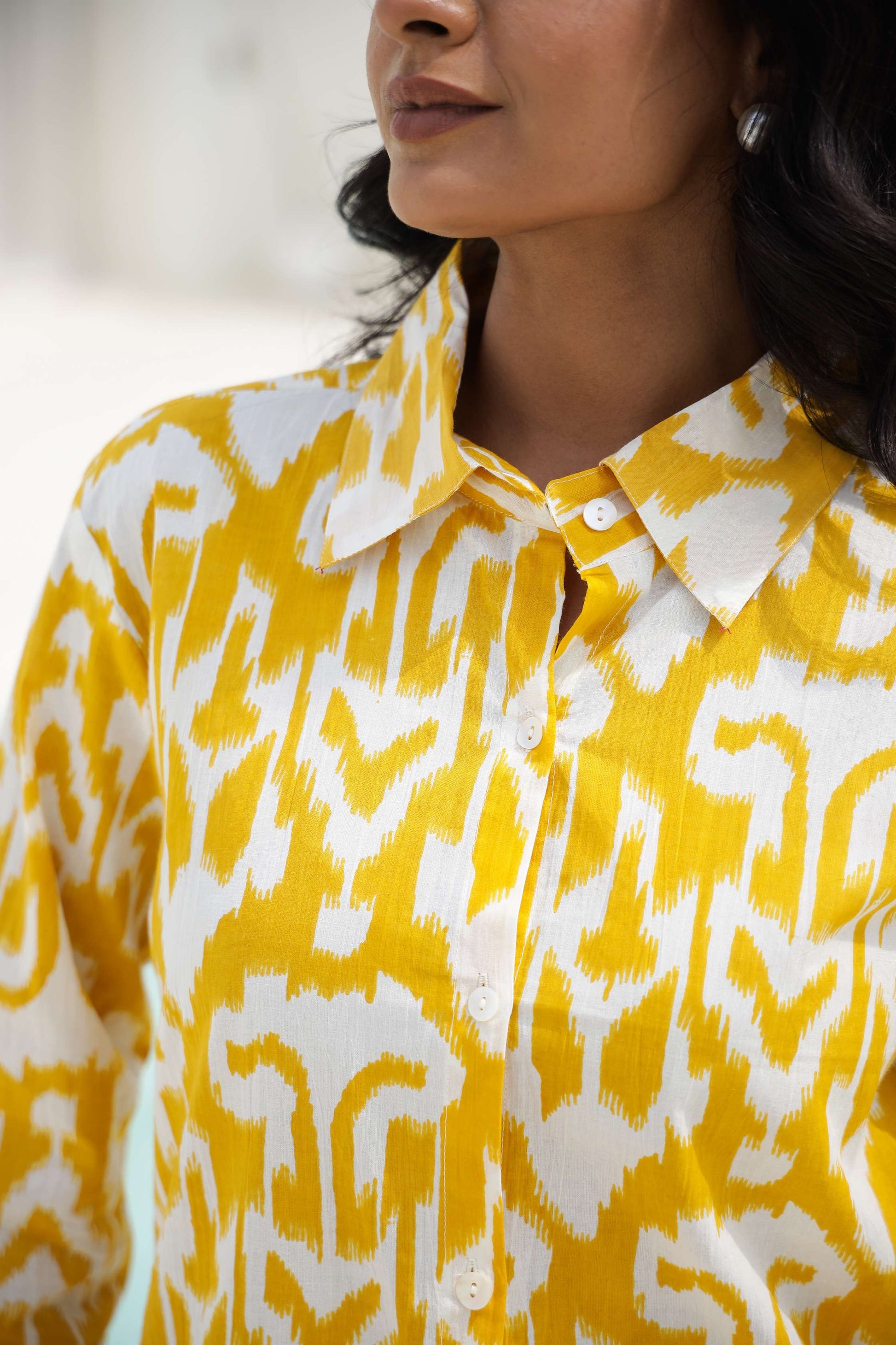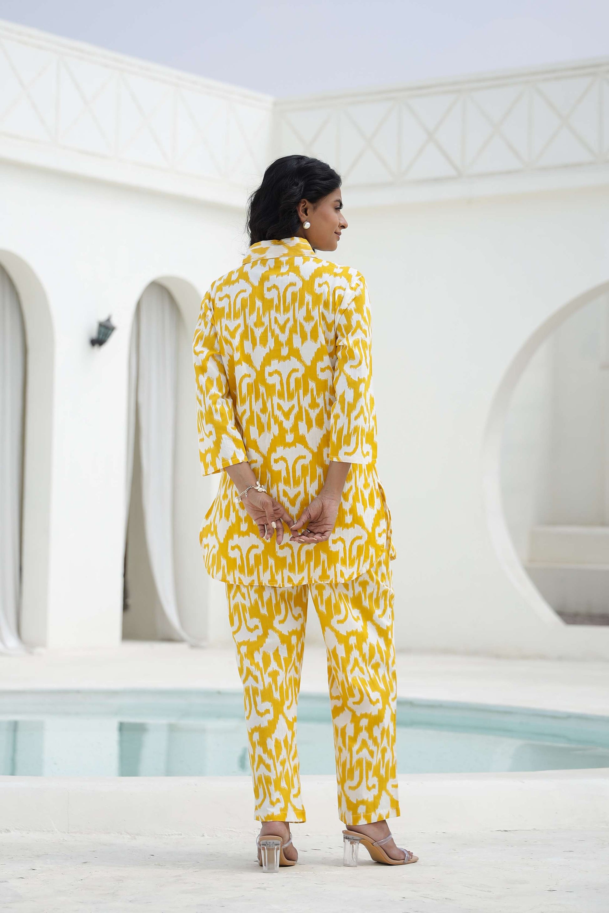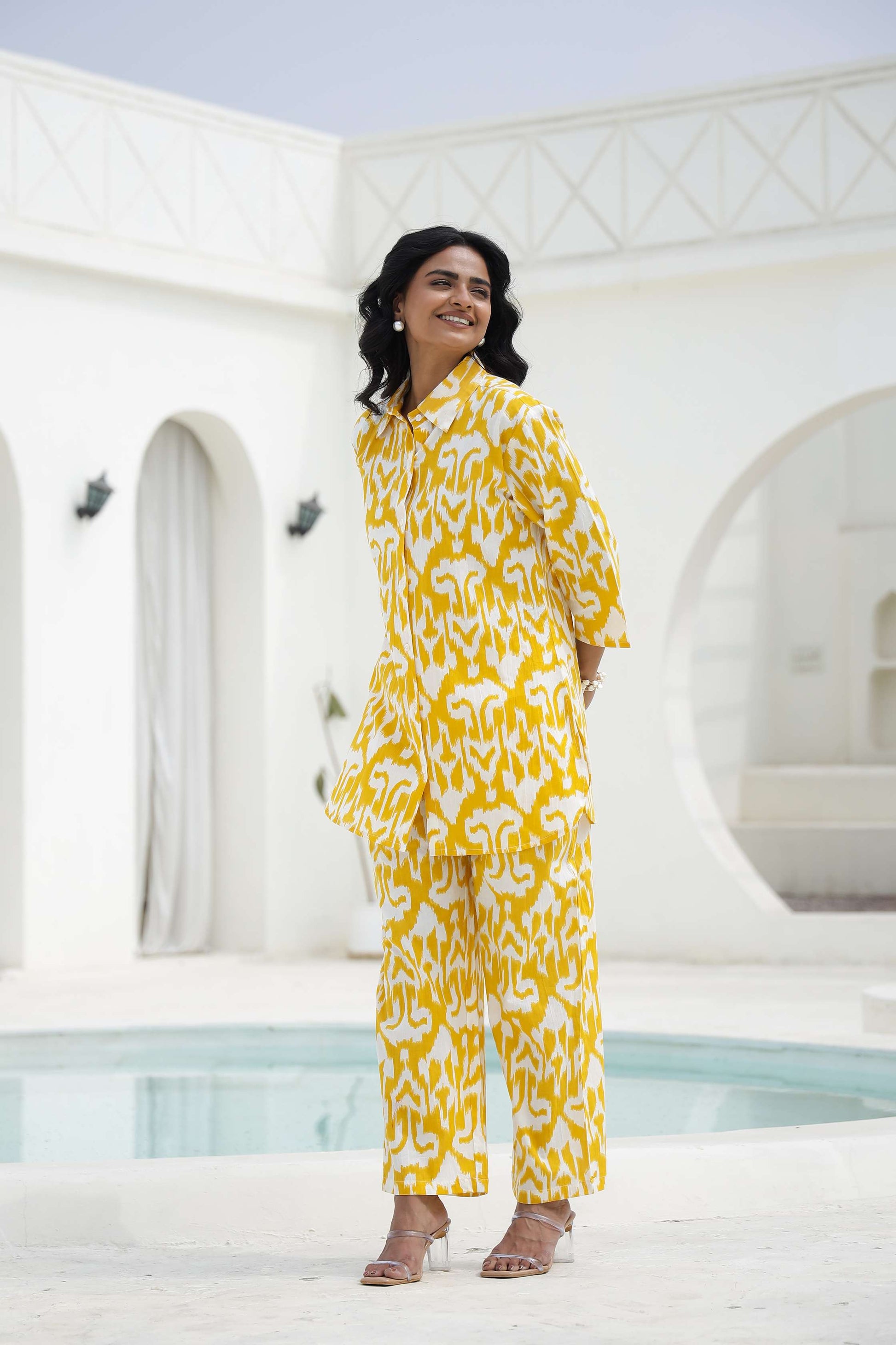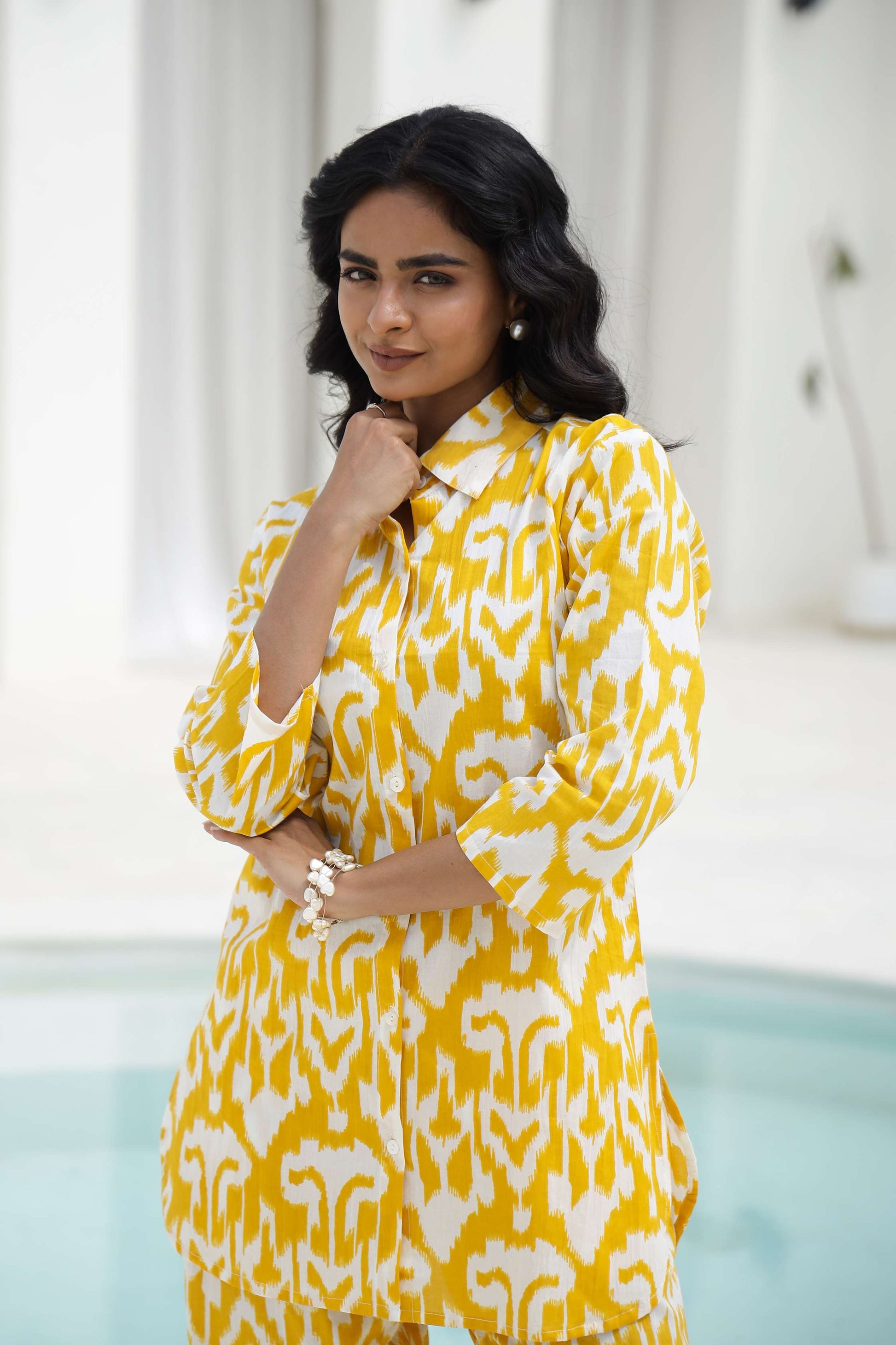 Make a bold statement with our stunning Vibrant Yellow Ikat Print Co-Ord Set. Designed for both comfort and style, this set features a relaxed-fit tunic with a button-down front and matching straight-leg pants. The striking yellow and white ikat pattern adds a touch of elegance, making it perfect for casual outings, brunch dates, or vacation wear.